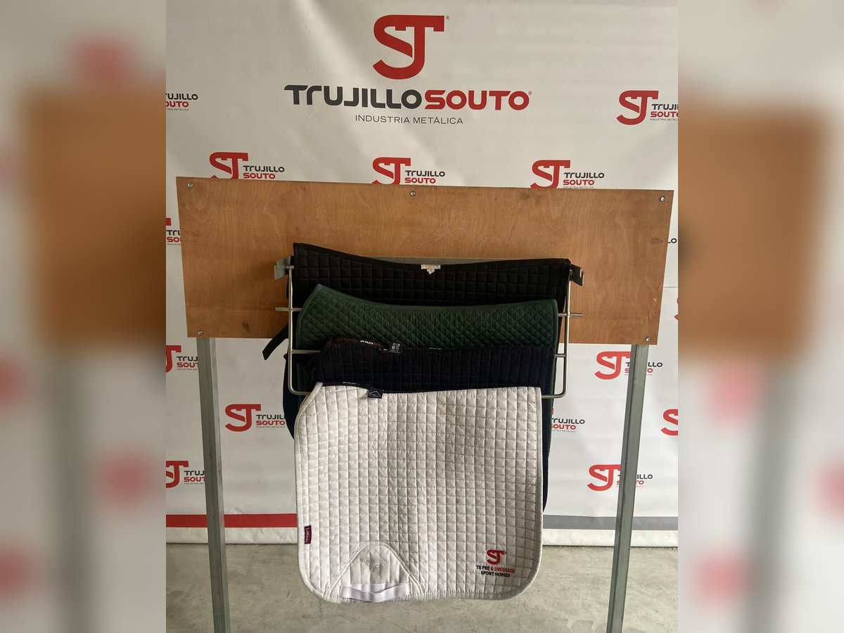 Colgador Mantillas ideal para colgar mantillas (también protectores o vendas) sus dos posiciones, nos permite que queden separadas para facilitar el secado del sudor o después de lavarlas, o plegadas lo que hace que ocupe el mínimo espacio, al ser un producto de acero inoxidable el sudor, agua, arena… no produce corrosión. Fabricado 100% en Acero Inoxidable calidad AISI 304, y soldado a TIG aportando varilla de acero inoxidable calidad AISI 316.