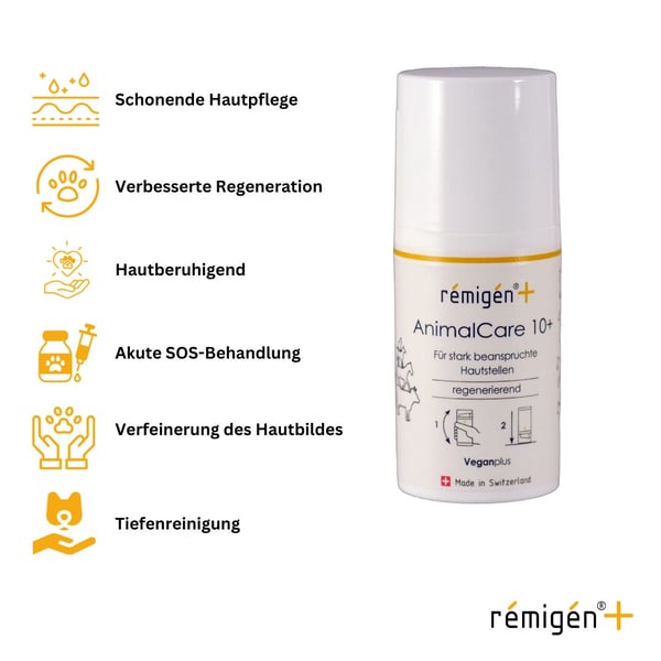 · rémigén+ AnimalCare 10+: Ideal für einfachste Hautbedürfnisse und zur alltäglichen Unterstützung der Hautregeneration und Pflege bei leichten Irritationen.