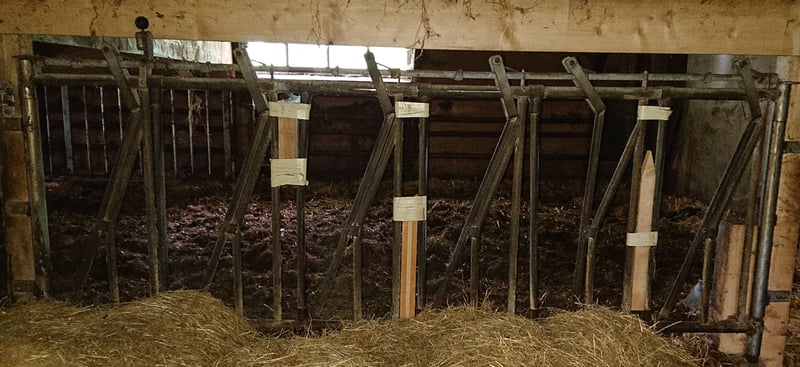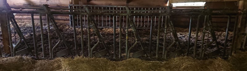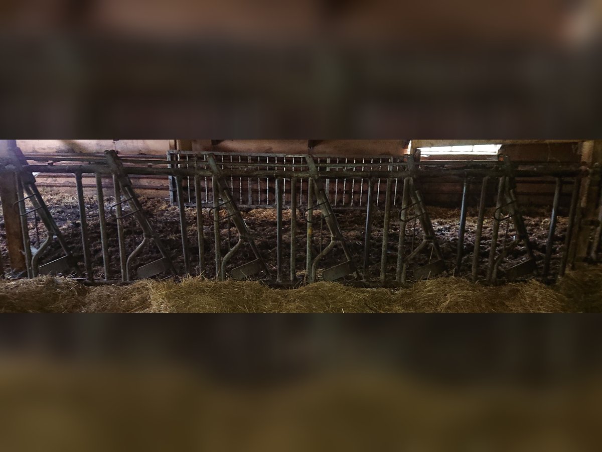 Selbstfangfressgitter: von Patura: Bild 1: 6 Fressplätze, L 4,81-5m, NL 5m, gebraucht, 680 € VHB Bild 2: nicht von Patura: 6 Fressplätze, L 3,2,, gebraucht, 300 € VHB Bei Abnahme mehrerer Fressgitter Preisnachlass möglich. Aufgrund der Aufgabe der Mutterkuhhaltung stehen weitere Stalleinrichtungen zum Verkauf: Abtrennungen/Tore von Patura und Raufe.