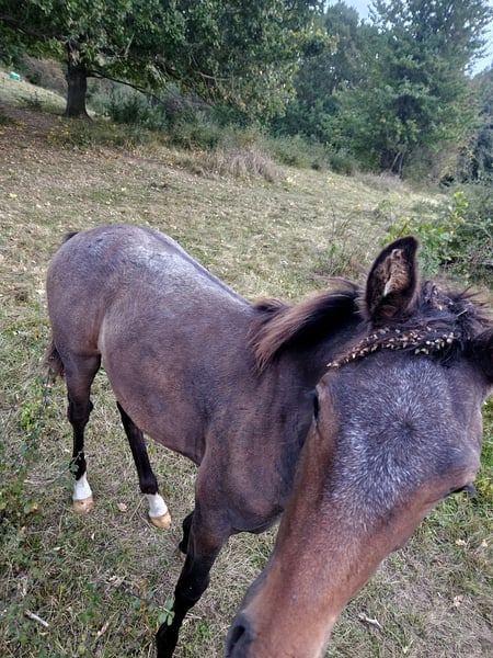 Knabstrupper sport filly with a red passport. Super elegant filly sired by Spotilas Boesgaard (from Totilas) with Blue Horse Zack as maternal grandfather. Awarded 9 in type, 9 in frame, 8 in foundation, 8 in movement, and 9 overall. The dam has been trained up to S-level dressage. The foal is color tested, carries the LP gene, and has begun changing color from brown to roan with dorsal stripe, and spots on the rump. She is born on April 27, and will be ready to leave home from November. Fantastic temperament, quick to learn, loving, and independent. Expected height 165 cm.