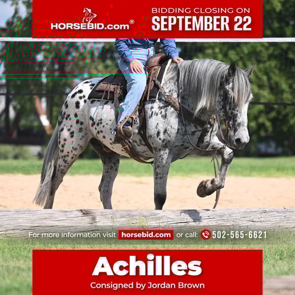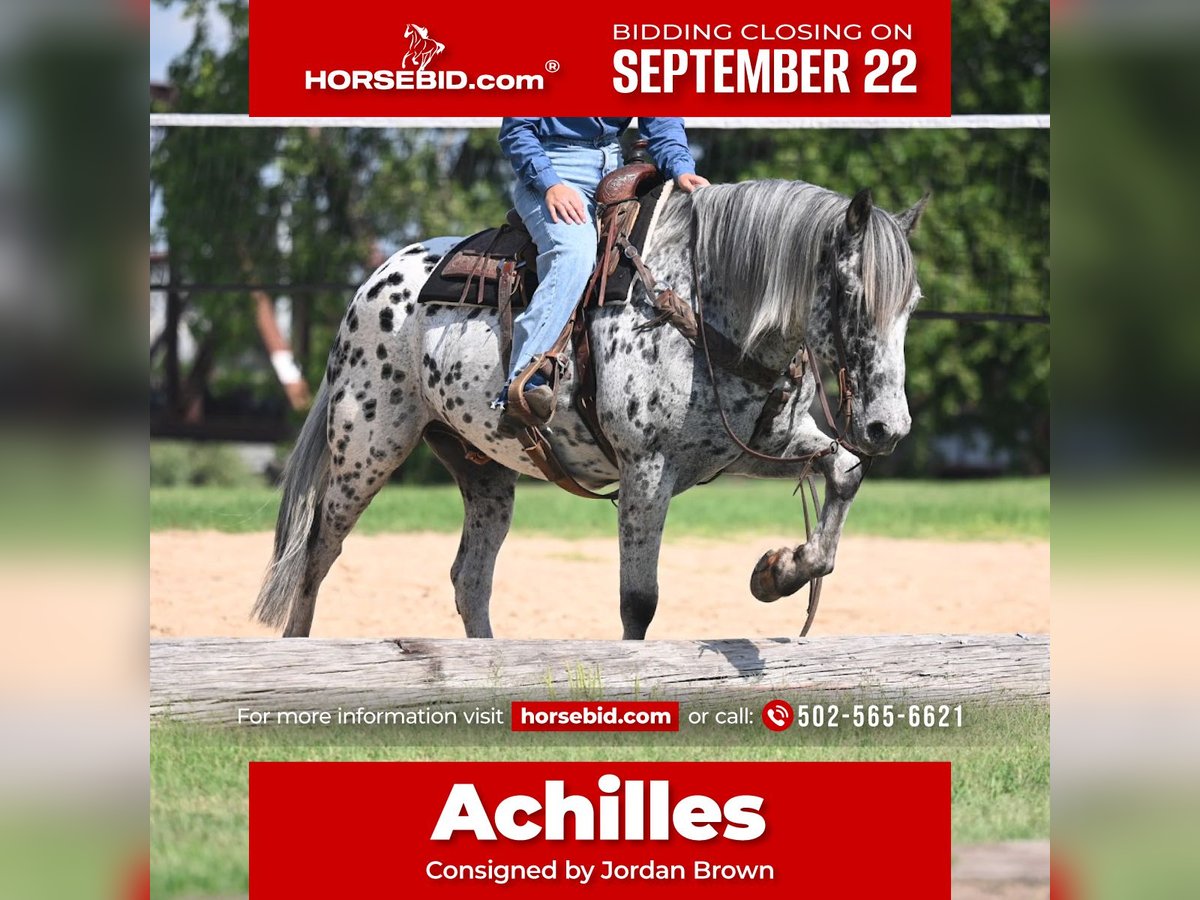 🍁𝒕𝒉𝒆 𝐅𝐀𝐋𝐋 𝑺𝒑𝒆𝒄𝒕𝒂𝒄𝒖𝒍𝒂𝒓🍁 Happening now thru MONDAY | SEPTEMBER 22nd - Available EXCLUSIVELY on HorseBid's website! For more details and to register visit: www.Horsebid.com CONSIGNOR CONTACT: Jordan Brown 502-565-6621 LOCATION: Waco Texas BREED: Knabstrupper REGISTERED: No COLOR: Leopard Appaloosa HEIGHT: 16 AGE: 10 GENDER: Gelding If handsome and kind are at the top of your list, this is your guy!! Achilles is a magnificent 10 year old Knabstupper gelding standing a true 16 hands with a classy, unique look, tons of bone, and plenty of color!! The ultimate trail and family horse who’s been there and done that with the demeanor to suit any rider. Achilles has spent the majority of his life as a ranch mount; saddled way before daylight and most days coming in well after the sun goes back down. He has seen all types of terrain from Montana to Texas and everything in between including but not limited to: deep washes, steep mountains, thick brush, mud bogs, rivers/creeks/streams, snow, ice, wind & rain. Rides english as well! Very enjoyable to school dressage or pop over some low level jumps if you get a wild hair! Many many miles and lots of wet saddle pads have prepared him for nearly any situation you may find yourself in. He keeps a cool head and has the most forgiving and friendly disposition you could ask for. Walks out on a loose rein, has a plush jog, floating extended trot, and a rolling canter. Neck reins and moves off leg, side passes to open and close gates, crosses bridges, navigates narrow paths with ease, doesn’t mind traffic, machinery, dogs, or children. In fact he ADORES children. Stack as many as you like on him and he will gladly pack them around at a gentle walk. Terrific ground manners, an absolute dream to shoe, and loves nothing more than a good bubble bath! Easy to clip, groom, saddle, and mount. His resumé, no matter how impressive, is unmatched with his one-of-a-kind personality… this horse brightens your day everytime you come to the barn. He will greet you with a nicker from the stall or canter to the pasture gate. Not a mean bone in his body and a perfect gentleman to be around and handle in any capacity. You won’t find a horse that enjoys his job as much as this guy! No nonsense and eager to please every time you pull him out whether it’s every morning before daylight or once a month! We would love to tell you more about this phenomenal horse! Call or text Jordan at (502) 565-6621. Shipping available worldwide