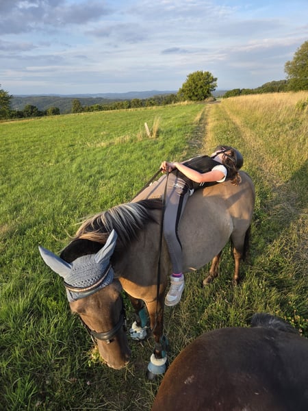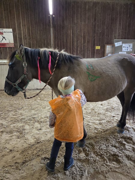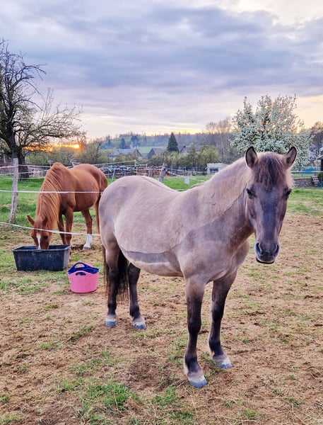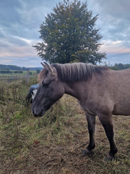 Wir suchen immer noch ein 5- Sterne Zuhause für unsere liebevolle Konik-Stute. Zum Verkauf steht unsere charmante Konik-Stute Berta, geboren im Jahr 2012. Sie ist eine freundliche und zuverlässige Begleiterin, die sich perfekt für den Freizeitbereich eignet. Mit ihrem Stockmaß von 135 cm und ihrem Körperbau ist sie sowohl für kleine Erwachsene als auch für Kinder geeignet. Ihre ruhige Art und ihr ausgeglichenes Wesen machen sie zu einem angenehmen Partner für Ausritte, Spaziergänge und gemeinsame Naturerlebnisse. Sie ist gesund, regelmäßig geimpft und gut gepflegt. Sie läuft barhuf und hat sehr gute Hufe. Sie hat weder Exem, noch jemals mit Hufrehe zu tun gehabt, obwohl sie bei uns im Sommer 24/7 auf der Weide steht. Sie ist absolut herdenverträglich. Wir wünschen uns für sie nur das aller beste Zuhause und geben sie nur ab, weil sie leider für das Turnierreiten nicht gemacht ist. Was wir uns vorstellen: Berta liebt das Gelände, sie geht sowohl als Handpferd mit kleinen Kindern, als auch in der Gruppe gerne über Stock und Stein. Sie geht mit Reiter schwimmen und liebt es, betüddelt zu werden. Sie sollte im Offenstall stehen oder tagsüber draußen und nachts in der Box. Sie hat einen Winter im neuen Stall mal mit Husten aufgrund der Heulagerung Probleme gehabt. Seitdem nässen wir das Heu im Winter und seitdem ist nichts mehr gewesen. Mit ihr wird aktuell im Reitverein das Bambini Reiten ausgeübt. Dort sitzen teilweise bis zu 4 Kinder auf ihrem Rücken, laufen unter ihr durch und wickeln sie komplett mit Klopapier ein. Sie ist grottenbrav. Hat aber auch mal ihren typischen Ponydickkopf. Bei Interesse oder für weitere Informationen stehe ich gerne zur Verfügung. Ein Kennenlernen vor Ort ist nach Absprache möglich. Berta wird selbstverständlich mit kompletten Zubehör abgegeben. Ich freue mich auf Ihre Anfrage!