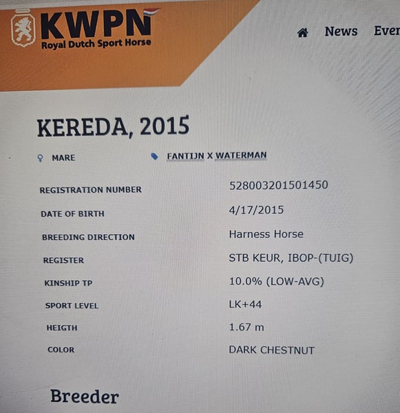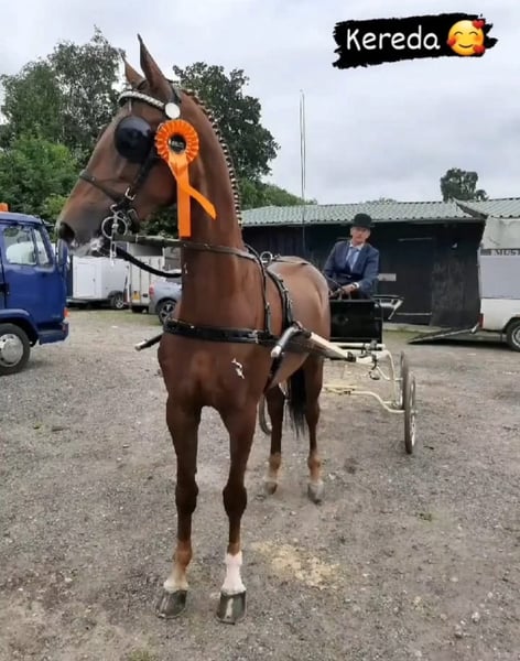 For sale: KWPN mare with Keur predicate Price: €6,000 Location: Croatia KWPN mare with Keur predicate, experienced in both single and pair driving. She is completely healthy and in foal to a KWPN stallion. Kereda is a calm, reliable, and well-balanced mare, currently living in a loose housing system with three other horses. She is non-dominant within the herd. Height: 167 cm at the withers. She has a passport and pedigree. She has participated in several driving competitions in the Netherlands. Part exchange possible: interested in a marathon carriage for a pair or a KWPN Tuigpaard colt, bay (brown) in color, with four white legs.