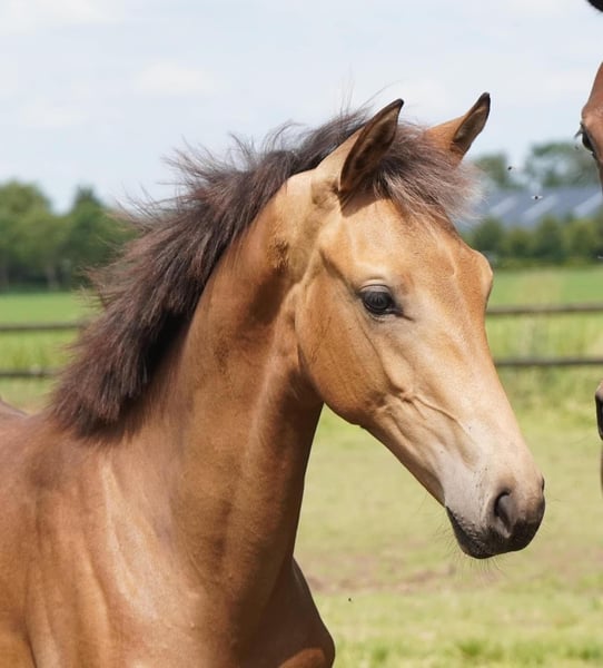 Magnifique pouliche pleins papiers KWPN de 2024 de couleur isabelle 😍 Elle a de très bonnes origines dressage: 🧬 Qandide x Franklin Elle tient sa couleur de son père qui est jeune étalon hanovrien de dressage cremollo par Quasi Gold (Quaterback) x Floriscount. Sa mère KWPN est par l’étalon de Grand Prix international Franklin et une lignée maternelle par Bon Bravour (Painted Black). Née en Hollande et actuellement située près de Lyon (69). ****************************************** Gorgeous 2024 KWPN filly, buckskin colored 😍 International dressage bloodlines: 🧬 Qandide x Franklin She owes her golden color to her adore who is a cremello dressage stallion by Quasi Gold (Quaterback) x Floriscount. Her dam is by the international Danish stallion Franklin, and a dam line by Bon Bravour (Painted Black). Born in Holland, she is currently located near Lyon, France.