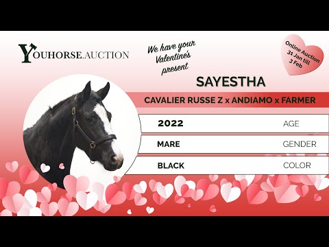 https://youhorse.auction/en/auction/Sayestha-CAVELIER-RUSSE-x-ANDIAMO Unique opportunity Descending from one of the best performance damlines in the Netherlands. Ideal for those looking for a future sport horse, but equally valuable for building a strong breeding foundation. A proven damline delivering quality generation after generation. Young mare with quality, carefulness and technique Sayestha is a beautiful dark bay mare who will only turn two years old. She jumps with a lot of quality, is careful, and shows good jumping technique. She moves easily, is light-footed and already demonstrates natural ability at a young age. A very interesting young prospect for the future. Sire Cavalier Russe Z (Casall x Valentina van ’t Heike) is licensed with BWP. Through Casall (international 1.60m GP), he transmits scope, technique and attitude. His dam competed at 1.60m level. Damline The dam Destha (Andiamo) competed at 1.35m and descends from an exceptionally strong performance family. Andiamo competed internationally at 1.60m and is known for passing on scope and rideability. This damline has produced numerous international sport horses and approved stallions, including: – Ipsthar (Denzel v’t Meulenhof), approved KWPN, international 1.60m – Veshtigo Z (Vigo d’Arsouilles), 1.45m – Hastha La Vista (Vigo d’Arsouilles), 1.35m – Jestha (Denzel v’t Meulenhof), 1.35m – Nunjestha (Hermantico), 1.30m – Nesthar (Matisse de Mariposa), 1.35m – Balestha (Indorado), 1.50m – Ralvesther (Calvaro Z), 1.60m – Twisther (Farmer), approved AES, 1.60m – Jesther (Cardento), 1.60m – Fasther (Vigo d’Arsouilles), winner at 1.60m – Kindesth (Vagabond de la Pomme), 1.55m – Lavesther (Elvis ter Putte), 1.50m – Hervesther (Elvis ter Putte), 1.55m An exceptionally deep damline with extensive sport from 1.30m to 1.60m level and multiple approved stallions.