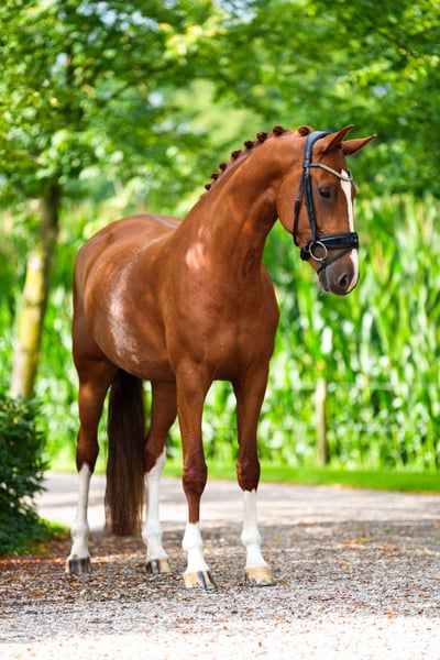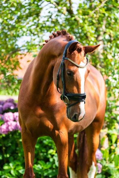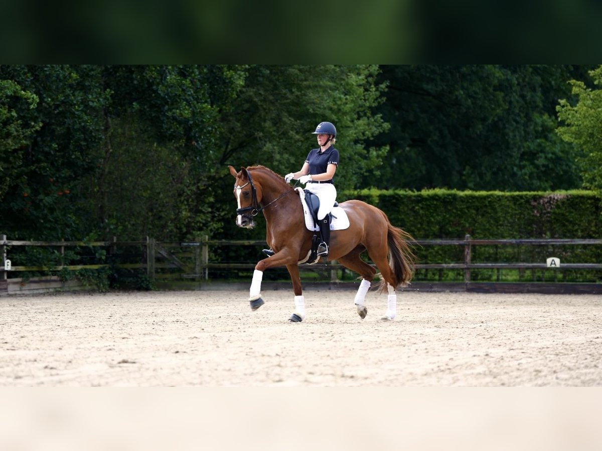 Posh is a five-year-old chestnut mare by Valverde x Sezuan x Jazz. She comes from a well-known breeding line of Emmy de Jeu, recognized for breeding quality and reliable horses. Her grandmother is currently competing at the international Grand Prix level. This five-year-old mare has three beautiful gaits and a nice, uncomplicated character. She is friendly and easy to handle, and under saddle, she has a lot of 'go' and work ethic. This makes her a pleasant and motivated horse to train with. She is suitable for a professional rider, but also for an amateur or for someone transitioning from pony to horse. She rides the same on unfamiliar ground as she does at home. Posh is currently being successfully shown in the M1 class, where she regularly achieves high scores above 65%. At the mare inspection as a four-year-old, she already stood out with a score of 75 points for conformation and 80 points for movement, making her the best mare of the inspection round and earning her the STER predicate. Posh has recently (June 2025) been approved both clinically and radiographically. In summary: a young, talented mare with a top character and proven performance, ready to further grow in the sport! Interested? Please contact for more information! The rider in the video and photo is 1.74m tall. Asking price is €38,500.
