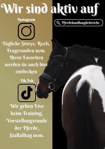 Penotti ist eine 6 Jährige KWPN Stute ca. 174 cm v. Imposantos, Krack C x Sandreo, Sandro Hit, Samber *Penotti* Worte werden nicht ausreichen um dieses Außnahmepferd zu beschrieben. Wunderschöne, gut ausgebildete, rittige und aller coolste Stute die man nur finden kann. Sie ist für den Profi wie für den puren Anfänger/-Angstreiter geeignet. Sie bringt 3 sehr gute GGA mit, ist bis L1 bereits in NL platziert auf dem Turnier und macht alles mit. Ausreiten alleine und in der Gruppe sowie in fremder Umgebung ist kein Problem. Reiten auf Halsring, auf der Hauptverkehrsstraße, Planen...alles mit ihr super entspannt. Penotti mag auch Stangenarbeit und ist schon brav über Baumstämme gesprungen. Sie ist sehr rittig und nimmt einen in den Bewegungen gut mit. Wir würden jedes Kind ruhigen gewissens auf sie setzen. Neben ihr sind bereits Presslufthammer losgegangen und auch das macht ihr einfach nichts aus, cooler geht es nicht. Ausdrucksstark dazu in Bewegung und Optik, gepaart mit einem Charakter, der besser nicht sein könnte !!! SCHAUEN SIE SICH UNBEDINGT IHR VIDEO AN !!! Ein qualitätsvolles Pferd mit jeder Perspektive im Sport und genau so gut das Verlasspferd für ängstliche Reiter. Im Umgang verschmust und unkompliziert. Weder im Umgang noch beim reiten stutig. Ein Traumpferd welches man eigentlich nicht findet. Große aktuelle AKU bringt sie bereits mit. Ein aktuelles Video finden Sie hier in der Anzeige oder unter folgendem Link: https://www.youtube.com/watch?v=9fnfiMG4fGM Pferdehandlung Dederichs – Ihr Partner für den Pferdekauf Kontakt & Erreichbarkeit: Anfragen bitte ausschließlich telefonisch unter 0173/9792139 Montag – Freitag: 09:00 – 18:00 Uhr Samstag: 09:00 – 15:00 Uhr Sonntag: Ruhetag Folgen Sie uns auf Social Media! Erleben Sie unseren Alltag mit den Verkaufspferden auf Instagram, TikTok & Facebook unter Pferdehandlung Dederichs Rabatt: Bei sofortiger Mitnahme Ihres neuen Traumpferdes erhalten Sie zwischen 5 %– 10 % Rabatt Probereiten & Vorführen: • Probereiten: 40 € pro Pferd (max. 2 Reiter), Betrag wird beim Kauf angerechnet • Feiertage: Proberitt 50 € • Vorführung durch unsere Bereiter: 30 € pro Pferd (Vorreiten, Bodenarbeit etc.) Ankaufsuntersuchung & Transport: • Viele unserer Pferde besitzen bereits eine AKU • Sie können selbstverständlich Ihren eigenen Tierarzt mitbringen • Gerne organisieren wir eine Untersuchung • Wir unterstützen Sie auch gerne beim Transport ins neue Zuhause Weitere Verkaufspferde: In unserem Stall stehen weitere Verkaufspferde, die noch nicht online sind. Falls Ihr Traumpferd noch nicht dabei ist, zögern Sie nicht, uns zu kontaktieren. Wichtige Hinweise: • Stockmaß-Angaben sind geschätzt und nicht exakt nachgemessen • Alle Beschreibungen sind subjektive Einschätzungen des Verkäufers und keine zugesicherten Eigenschaften