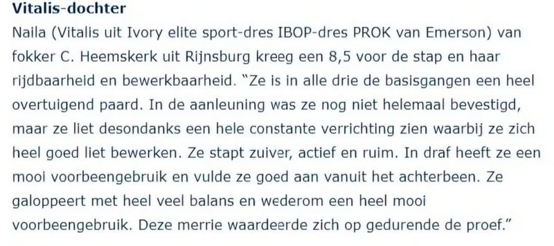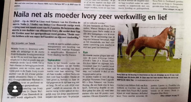 Kapitale en zeer ruig bewegende merrie die als beste merrie van de IBOP in Lisse uit de bus kwam met 81.5 punten. Heeft bij ons ondertussen 2 mooie veulens gehad en is wegens een laat veulen in 2025 niet gedekt. Ze komt uit een lijntje met veel sport en predicaten. Oma Daisy, moeder Ivory en zo nog een aantal anderen uit het lijntje zijn bij ons te zien en zijn paarden die door iedereen bereden kunnen worden - jong en oud - ervaren en onervaren. Als 2.5 jarige 100% goed op de foto inc. rug/hals, mag nogmaals gekeurd worden k.k. Door een spierscheurtje in de (verkorte spier) onderhals heeft ze moeite met de aanleuning / balans. Te koop als fokmerrie of recreatiepaard, na 3 jaar niet rijden weer onder het zadel geprobeerd en topbraaf (whatss app voor filmpjes), niet schrikachtig, goede looplust. Zou een fantastisch paard zijn voor buitenritten en zou ook een man op passen qua maat. Paard met kwaliteit en een super karakter wat zeker geschikt is voor de fokkerij! Haar moeder Ivory (Elite, ibop, prok, sport Z2 dressuur, NMK) was in Nederland 5e van de kampioenskeuring als 3 jarige en liep als jong paard in de halve finale van de Pavo Cup en in verschillende jonge paardenrubrieken eindigde zij hoog. Oma Daisy mocht als 3 jarige ook naar het NMK en is elite, prok, ibop, sport ZZ zwaar. Zowel de moeder Ivory als oma Daisy staan nog bij ons op stal. Ivory komt na het veulenen ook beschikbaar, Daisy is in het bezit van een familie als betrouwbaar leerpaard.