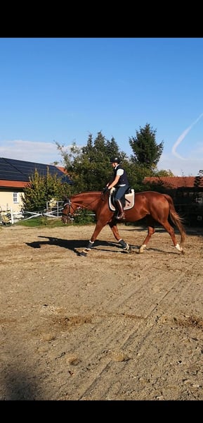 Se ofrece una yegua excepcional. Debido a cambios en la pensión, estoy considerando vender a mi yegua KWPN de 9 años. No es una venta de emergencia y la yegua solo será entregada a un comprador de confianza. También sería posible ofrecerla como yegua de cría. Preferiblemente a partir de marzo. La yegua fue distinguida en Karpfham como reserva de la campeona. Tiene un movimiento excelente y una genealogía fantástica. Lamentablemente, presenta hallazgos en el examen de casco que no tenía a los 3 años y, hace tres años, también tuvo problemas en la articulación del casco. Sospecho que sufrió una caída grave en el pasto en algún momento. En el momento de la compra, a los 3 años, fue apta para revisión veterinaria o sin restricciones. En manejo, es una yegua muy cariñosa y también muy tranquila bajo la silla, aunque requiere un trabajo constante. No es apta para principiantes. En campo, con una segunda montura, es absolutamente segura; sola necesita instrucciones claras y confianza, y en caminos conocidos también se comporta muy bien. No hay problema con autos o tractores. Entra sola en el remolque. Es una yegua de herrar. Tiene herraduras en las cuatro patas y en la parte delantera necesita una plantilla de cuero con relleno de cáñamo sencillo. Desde entonces, no ha tenido problemas en la articulación del casco. Fue tratada en clínica, más detalles por privado. (Tres años sin cojera). Se recomienda una visita previa para conocerla. Nivel de jinete mínimo A. Actualmente, está en plena doma y en entrenamiento. El sillín, comprado hace unas semanas, puede incluirse por un precio adicional (sin problemas en la espalda desde entonces). Disponible para una conversación personal. No se ha presentado en competiciones, ya que no tengo interés en ello. Tiene inscripción y certificado de origen. No ha sido vacunada para competición, pero recibe vacunación regular contra tétanos e influenza. Prueba negativa en PSSM. También puede ser asegurada con un seguro de operaciones (R&V premium). Como mencioné, solo se vende a un comprador de confianza. Se pueden enviar más vídeos a petición. Todo el equipo necesario está incluido y el precio es negociable. No tengo interés en el dinero; simplemente quiero encontrarle un buen lugar donde esté bien cuidada.