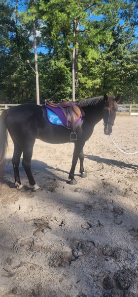 15.1 hand black Dutch Warmblood. Jumper. Registries with both USEF and KWPN. High energy but FUN to ride. Needs a confident rider. Not bite, kick, buck, or rear. Easy to be around with great ground manners. Stands to be mounted and discounted. 3 easy gaits with nice transitions and an easy whoa. Lead changes when you ask. Really nice lil guy.
