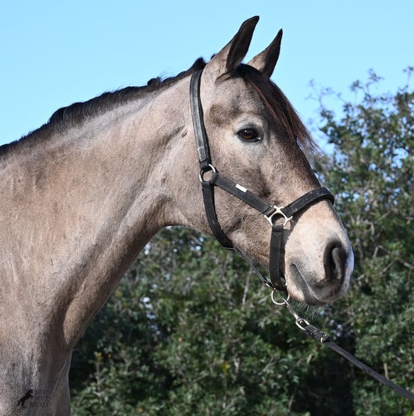 This 2010 born dun (currently in winter shearing, hence the gray color), is a mix of Lusitano and KWPN. He and his owner have been very successful in the dressage arena and have placed several times! Lateral movements, flying changes, canter pirouettes - all a piece of cake for this gelding. He also enjoys going into the field and even parades, such as the traditional animal consecration, with loud music and crowds of people, don't bother him! He is a real treasure to handle, a real protector and gentleman who never takes a wrong step or makes a wrong move. On the lunge he runs like clockwork, responds really well to voice commands and is also clever, because it was very windy at the photo shoot and he had his ears set to aerodynamics ;) Under saddle he WANTS to work and really blossoms. So he is a horse for someone who encourages him and works him 5 times a week, because the two performance breeds in his blood want to be kept busy. It is better to work him 7 times a week than only twice, which is why he is not really suitable for casual leisure riding. As a show professional, he is also easy to load, knows how to be in new places and in his summer dress he is also a real treasure on the outside (photos available). He has also been shown at shows by teenagers with riding experience and behaved well - but they were also kids who can really control his gas ;) He has been a gelding for a long time, so he could easily be integrated into a mixed herd. A fun horse for ambitious riders in his prime! He is currently on Mallorca! Videos and pedigree available on request. I would be happy to organize an AKU, riding, transport or even your trip if you come to see him in person. Details can be found on my website or in conversation. Saludos from Spain