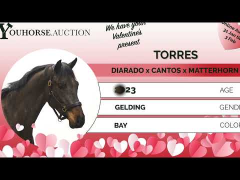 https://youhorse.auction/en/auction/Torres-DIARADO-x-CANTOS Torres is a three-year-old sport horse with a good model and correct type. He jumps easily with correct technique and shows blood and an uphill canter. He is quick off the ground, jumps with ease and shows a good attitude. In our opinion, a fairly complete horse for the future. Sire Sire Diarado competed at 1.50m level. As a son of Diamant de Semilly (1.60m Grand Prix) and grandson of Corrado I, he is one of the most influential sires in modern showjumping breeding. His offspring include top-level Grand Prix horses such as Don Diarado, Donatello 141 and Karoline of Ballmore (all 1.70m). Dam and damline Dam Herberlina T (Cantos) is elite IBOP(spr) and D-OC. She produced several sport horses, including: Marlinus T (Grandorado TN N.O.P.) – international 1.30m jumping Kimberlina T (Genius) – 1.30m jumping Merlinus T (I Am London Apple) – 1.30m jumping Granddam Adalina T (Matterhorn) is elite and preferent and produced, among others: Karlina T (Cabrio van de Heffinck) – 1.35m jumping Great-granddam Rosalina (Indoctro) produced a very strong sport line with: Feliberlina T (Silverstone) – 1.40m jumping Gerinus T (Arezzo VDL) – 1.45m jumping Hoberlina T (Quality Time TN) – 1.40m jumping Janico-N (Inshallah de Muze) – 1.35m jumping The fourth dam Coberlina (Uniek) forms the foundation of a proven international damline, including: Camillion van de Linthorst (Emilion) – 1.45m Grand Prix Djibab van de Linthorst (Nabab de Rêve) – 1.45m Grand Prix Harley (Harley VDL) – 1.55m Grand Prix Di Caprio RV (Verdi TN) – 1.50m Grand Prix