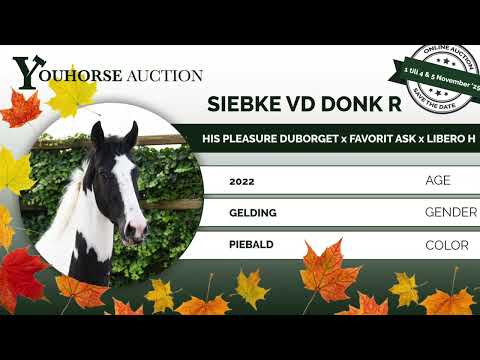 Die dreijährige Siebke v.d. Donk R ist eine schön gezeichnete Paint-Horse-Stute mit einer leichtfüßigen Art zu bewegen und zu springen. Unserer Meinung nach ist sie für mehrere Disziplinen geeignet. Vater ist der 8-jährige AES-Hengst His Pleasure Duborget, Halbbruder von drei Springpferden bis 1,50 m und fünf bis 1,40–1,45 m, gezüchtet aus der Halbschwester der Grand Prix-Hengste Rahotep de Toscane und Jadis de Toscane, die jeweils 1,60 m springen. Die Mutter Mosegaard’s Franciska ist eine bunte Stute, die von Favorit ASK abstammt (Springen bis 1,45 m). Das Farbgen hat sie von ihrer Mutter Mosegaard’s Rigolettels (Libero H x Samber) geerbt.