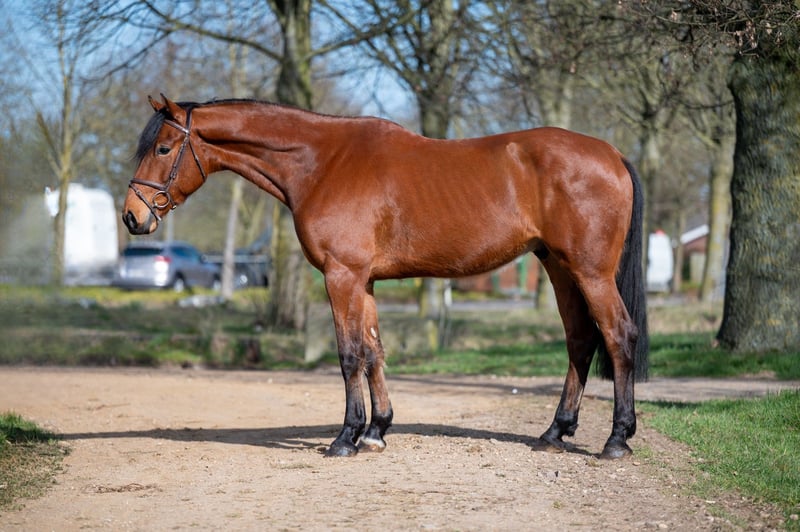 Ce dur à cuire pourrait-il conquérir votre cœur ? Picardie est un fils de Jardonnay VDL et provient d’une jument Coriander qui a elle-même sauté avec succès jusqu’à 1,35 m au niveau national. Picardie a pu grandir tranquillement au pré jusqu’au printemps dernier, et il est donc prêt à commencer le travail monté, bien qu’il ne soit pas encore complètement débourré — un jeune cheval prometteur à former vous-même. Il est agréable à manipuler, avide d’apprendre et montre beaucoup de puissance ainsi qu’un respect naturel pour l’obstacle. Nous pensons donc pouvoir offrir un cheval intéressant pour une formation ultérieure.