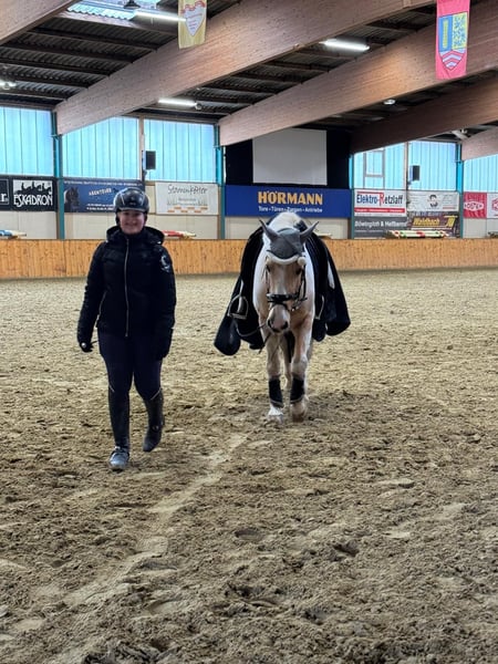 We sadly have to part ways with our 14-year-old pony, Paulchen. He was our daughter’s first pony, but now she wants to progress further, so we are looking for a new home for him. She has ridden him in dressage, show jumping, and cross-country. He enjoys hacking out, riding in groups on the racecourse, cantering around the arena with a saddle pad, and just having fun—he’s always up for a bit of mischief. He has also been driven in harness by his previous owners. In handling, he can be a bit of a rascal, which is why he is led with a chain halter. He is not a typical children's or beginner’s pony; he also suits experienced adult riders. He is well-built, stands approximately 1.48 m (15.1 hh), and is suitable for more advanced riders. Last spring, he was lame in the front right leg, where an arthrosis was diagnosed and treated at the Tierklinik Telgte. As a result, he should no longer jump. Paulchen is an Eczema sufferer. During the summer, he is kept outside 24 hours a day, wearing a fly mask and blanket, which we can include. If the hay is very dusty, he may cough occasionally. About three months ago, he was lame behind on the left side, likely due to a strain or similar issue. His leg was X-rayed, but nothing was found. Further information and videos are available upon request. Feel free to contact us or come by to meet this charming rascal.