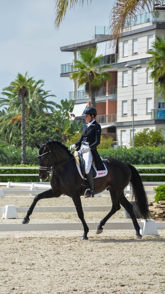 Eleganter schwarzer Lusitano – Grand Prix Niveau Dieser prächtige schwarze Lusitano-Wallach hat erfolgreich auf St. Georg Niveau turniert und tritt nun im Grand Prix an. Er vereint außergewöhnliches Talent mit einem wirklich außergewöhnlichen Temperament, was ihn für jeden Reiter geeignet macht – egal ob Profi oder Amateur. Er ist edel, leicht zu reiten und frei von Stallvorgiften. Seine Röntgenaufnahmen sind unauffällig, und er wurde stets mit größter Sorgfalt gepflegt. Eine seltene Gelegenheit, einen Lusitano von solch hoher Qualität zu besitzen – ausdrucksstark, willig und bereit, in der Arena zu glänzen.