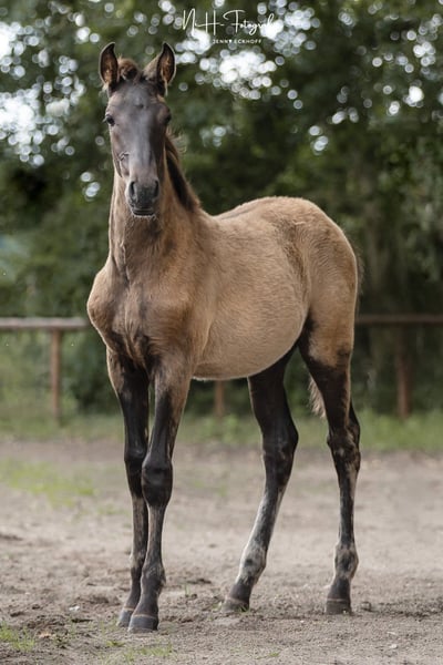 Notre Viu Uno UET est vraiment unique. Très proche des humains et doté de superbes mouvements, il est issu de notre jument primée Cereja CSM (Spartacus CSM) et du jeune étalon Ouro JCL (Riopele). Viu Uno grandit dans notre petite écurie et apprend avec nous l'ABC des poulains. Il est né en Allemagne et est donc exempt de piroplasmose. Viu Uno montre de superbes mouvements et possède, une fois qu'il aura perdu son pelage de poulain, une magnifique couleur noire.