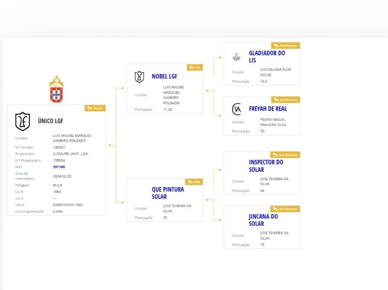 Potro lusitano de capa gorda espectaculares movimiento y genética espectacular de doma. Nieto de Gladiador do Lis caballo olímpico montado por José Antonio Garcia Mena. En mayo de 2026 cumplirá 2 años y tiene una alzada actual de 1’63 y una complexión física espectacular. En dos de las fotos del anuncio aparecen su padre y su madre y el vídeo es de una presentación en un morfológico cuando solo tenía un año.