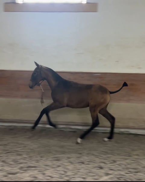 🌟 Lusitano Youngster with Top Genetics – "Viena" 🌟 - Breed: Lusitano - Sex: Mare - Year of Birth: 2025 - Color: Buckskin (without grey genes) - Estimated Height: 16.3 hh The young Lusitano mare Viena already impresses with her harmonious conformation, curiosity, and natural movement that simply makes riding enjoyable. She is a mare that you can easily envision under the saddle in dressage – modern, rideable, and with that certain something that stands out in sport. At the same time, her excellent pedigree makes her also interesting for breeding. 🧬 Excellent Lineage as a Guarantee of Quality Her sire, Hostil de Sena, is a performance-oriented stallion, licensed with over 70 points and standing at 1.66 m. He represents type, rideability, and athleticism. On the dam's side, she is out of none other than Escorial – one of the most renowned Lusitano sires worldwide, known for elasticity, presence, and an impressive progeny with international success. ➡️ With this pedigree, Viena has all the prerequisites to later reach over 1.60 m and excel in sport. 🐴 Character & Development Viena is growing up healthy within a herd, correctly conformed, very human-oriented, and shows a clever, pleasant personality. Her relaxed, well-timed basic gaits already hint at her sporting potential – especially for dressage and working equitation. 🎯 Future Prospects ✔ Talented riding horse for sport and leisure ✔ Valuable addition to breeding programs ✔ For ambitious individuals who appreciate quality 📩 Feel free to contact us for more information! Viena is waiting for someone who recognizes her talent and enjoys supporting her development along the way. ✨