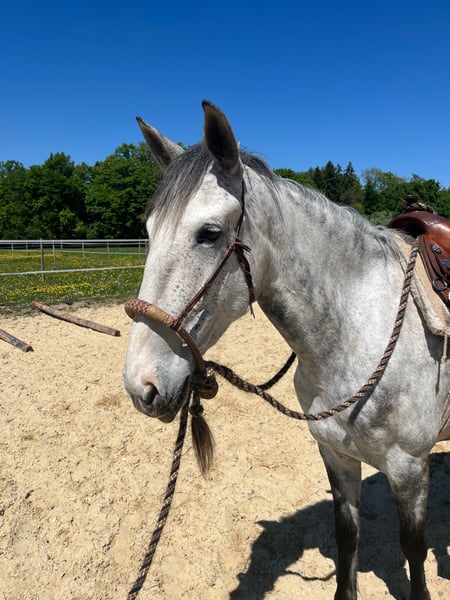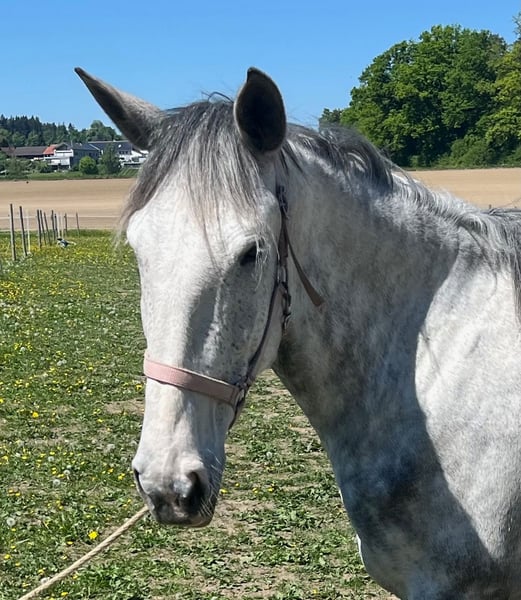 Paixao, une jument Lusitano extrêmement fiable et digne de confiance avec un grand potentiel pour les loisirs et également pour le dressage. La jument Lusitano impressionne par son calme et son respect envers les humains et ses congénères équins. Elle travaille de manière volontaire et équitable, que ce soit au sol ou sous la selle, se montrant élégante et sûre, que ce soit sur le manège ou en extérieur. Son potentiel se manifeste surtout au trot, qui est vraiment impressionnant ; de nombreux chevaux de dressage rêvent de tels allures. Paixao est en Suisse depuis un an et a été soigneusement travaillée d'abord au sol, ce qui comprenait le désensibilisation, l'entraînement au chargement, le parcours de trail, etc., et elle est en cours de travail depuis environ six mois. Elle est toujours concentrée et nous avons été régulièrement surpris par la rapidité et le calme avec lesquels elle aborde les nouvelles choses. La jument Lusitano sera un super partenaire pour une cavalière ou un cavalier ambitieux qui apprécie et soutient une race polyvalente comme le Lusitano.