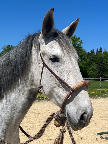 Paixao, an extremely trustworthy and reliable Lusitano mare with great potential for both leisure and dressage. The Lusitano mare impresses with her calmness and respect towards humans and her equine companions. Willing and fair, she works well both from the ground and under saddle, displaying elegance and confidence, whether in the sand arena or out on the trails. Her potential is especially evident in her trot, which is truly impressive; many dressage horses dream of such gaits. Paixao has been in Switzerland for a year and was carefully worked from the ground up, including desensitization, loading training, trail courses, etc., and has been in training for about six months. She is always focused, and we have repeatedly been surprised by how quickly and calmly she approaches new challenges. The Lusitano mare will be a fantastic partner for an ambitious leisure rider who appreciates and consciously promotes a versatile breed like the Lusitano.