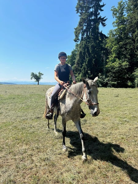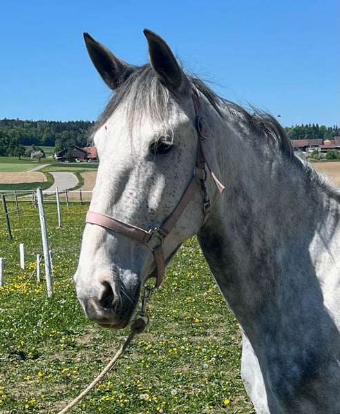 Paixao, eine äusserst vertrauenswürdige und verlässliche Lusitano Stute mit grossem Potential für Freizeit und auch Dressur. Die Lusitano Stute imponiert durch ihre Gelassenheit und dem Respekt gegenüber Mensch und ihren Pferdekollegen. Willig und fair arbeitet sie ob vom Boden aus und unter dem Sattel, zeigt sich elegant und sicher, ob auf dem Sandplatz oder im Gelände. Ihre Potential zeigt sie dann vor allem im Trab welcher wirklich beeindruckend ist, viele Dressurpferde träumen von solchen Gängen. Paixao ist seit einem Jahr hier in der Schweiz und wurde sorgfältig zuerst vom Boden gearbeitet, dazu gehörte auch Aussacken, Verladetraining, Trailparcours etc. und ist seit gut einem halben Jahr im Beritt. Sie ist stets konzentriert und wir waren immer wieder überrascht wie schnell und ruhig sie Neues angeht. Die Lusitano Stute wird ein super Partner sein für eine ambitionierte Freizeitreiterin / Reiter, die eine vielseitige Rasse, wie der Lusitano ist, schätzt und bewusst fördert.