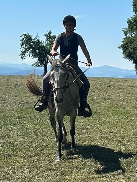 Paixao, una cavalla lusitana estremamente affidabile e di grande potenziale sia per il tempo libero che per la dressage. La cavalla lusitana si distingue per la sua calma e il rispetto verso le persone e i suoi compagni di scuderia. Volenterosa e corretta, lavora con entusiasmo sia a terra che sotto la sella, dimostrando eleganza e sicurezza sia in arena che in campagna. Il suo vero potenziale si manifesta soprattutto nel trotto, che è davvero impressionante – molti cavalli da dressage sognano andature simili. Paixao è in Svizzera da un anno ed è stata accuratamente iniziata a lavoro a terra, incluso il desensibilizzazione, il training al carico, il percorso di trail e altro ancora. Da circa sei mesi è sotto la sella. È sempre concentrata e siamo rimasti piacevolmente sorpresi dalla sua rapidità e tranquillità nell’affrontare nuove sfide. Questa cavalla lusitana sarà un partner fantastico per una cavallerizza o un cavaliere appassionato di tempo libero, che apprezza e promuove consapevolmente una razza versatile come il Lusitano.