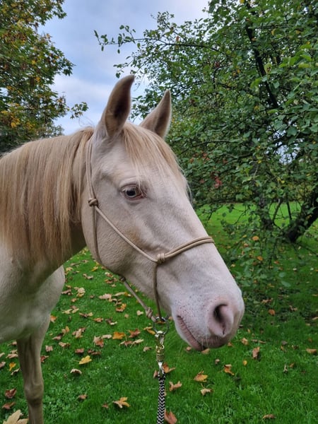 Stunning Cremello mare with blue eyes. Incredibly sweet and cuddly. Can be ridden both English and Western; she is currently being ridden Western. Also suitable as a broodmare. She is sensitive to aids and can be ridden well with a halter and lead rope. She is forward-going and responds well to the brakes. She has been under saddle for about 1.5 years and is still a bit green. She is eager to learn and picks things up very quickly. She enjoys working and wants to do her best. She is intelligent, sensitive, and brave. She is accustomed to traffic when walking, as we live near a busy road. Her hooves are very well-behaved and are regularly trimmed. The trailer is no problem either. She is turned out 24/7 in a small herd and is only fed roughage. Unfortunately, she needs to find a new home urgently due to lack of space, which is why the price is low!