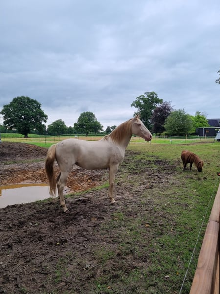 Magnifique jument cremello aux yeux bleus. Très douce et câline. Elle peut être montée aussi bien en dressage qu'en western, et elle est actuellement en western. Elle convient également comme jument de reproduction. Elle est sensible aux aides et peut être bien menée avec un licol à rênes. Elle est bien en avant et réagit également bien au frein. Elle a été montée pendant 1,5 an, mais reste encore un peu verte. Elle est curieuse et apprend très vite. Elle aime travailler et souhaite faire de son mieux. Intelligente, sensible et courageuse. Elle est habituée à la circulation lors de promenades. Nous vivons à proximité d'une route très fréquentée. Elle est extrêmement sage avec ses sabots, qui sont naturellement coupés. La remorque ne pose aucun problème. Elle est ici en pâture 24/7 dans un petit groupe et ne reçoit que du foin grossier. Malheureusement, elle doit partir en urgence en raison d’un manque d’espace, d’où ce prix bas !