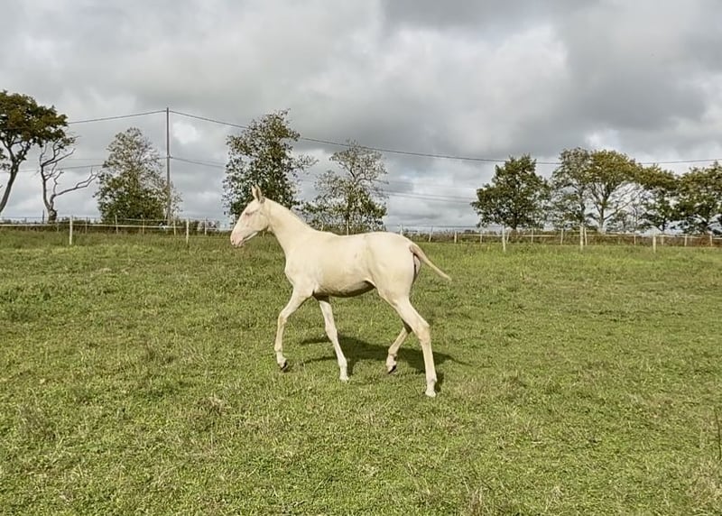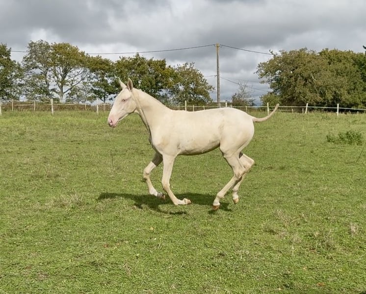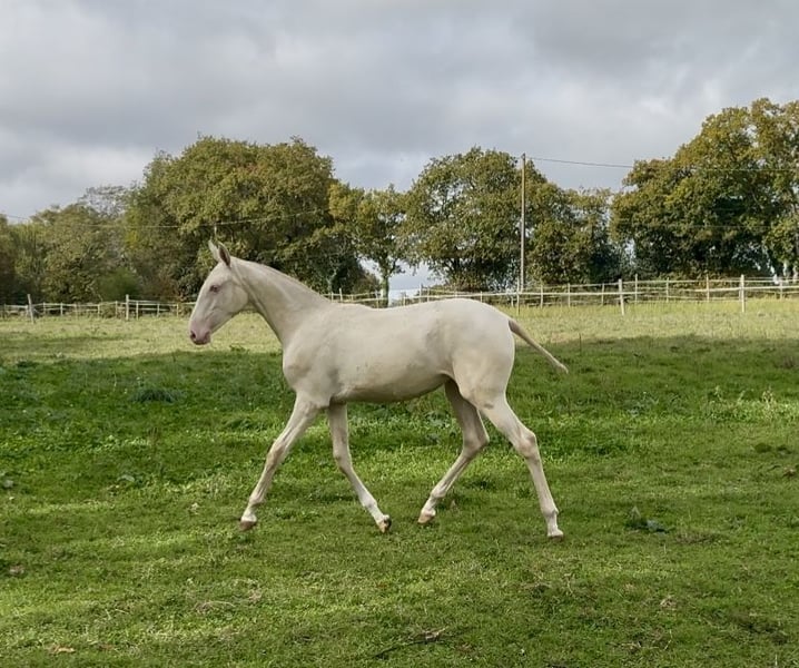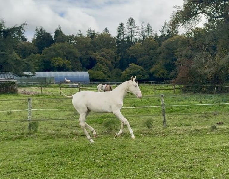 ✨ Unfortunately, we can't keep everyone... ✨ We are offering V-Pearl for sale, a stunning cream filly with blue eyes, born in March 2025. She is by Nopal out of Mariolas d’Al Baizir, and V-Pearl shows great potential: a harmonious build, elegant presence, and a curious, human-oriented temperament. She lives in the paddock with other horses, is handled regularly, and is up to date with all vaccinations, microchipping, and deworming. She is already over 1.35 m (approximately 13.3 hh). 📍Viewable in Guérande 💛 Rare color