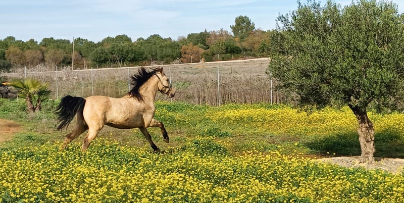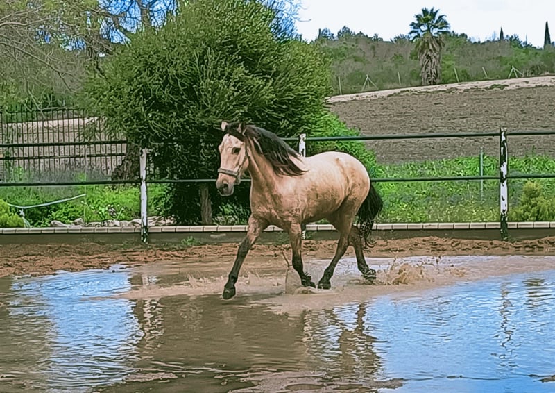 Apolo ist ein sehr aufgewecktes kleines und kompaktes Pferd mit wunderschöner Fellfarbe, sehr wachsam, clever aber manchmal ein Sturkopf. Wenn er zu dir Vertrauen gefasst hat, ist er verschmust, lernwillig und anhänglich. Er ist barhuf unterwegs was ihm keine Probleme bereitet. Er ist exzemfrei und überhaupt ein sehr robuster Bube. Mit ihm wurde hauptsächlich am Boden gearbeitet. Er ist auch eingeritten, reagiert ganz fein auf Hilfen und ist ein Pferd mit ausgeprägtem Vorwärtsdrang. Apolo ist absolut kein Anfängerpferd, braucht eine einfühlsame, klare konsequnze Führung und ausgewogene, regelmässige Beschäftigung. In der Herde zeigt er sich oft verunsichert und eher rangniedrig. Apolo lebt auf einer Finca im Jerez de la Frontera, die von meiner Schweizer Freundin geführt wird. Mein Bube wird nur an einen sehr guten Platz verkauft. Bei Fragen, erreicht Ihr mich unter der Nummer ±41 79 416 79 13 Silvia Kaufmann