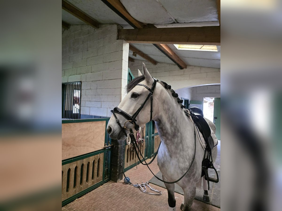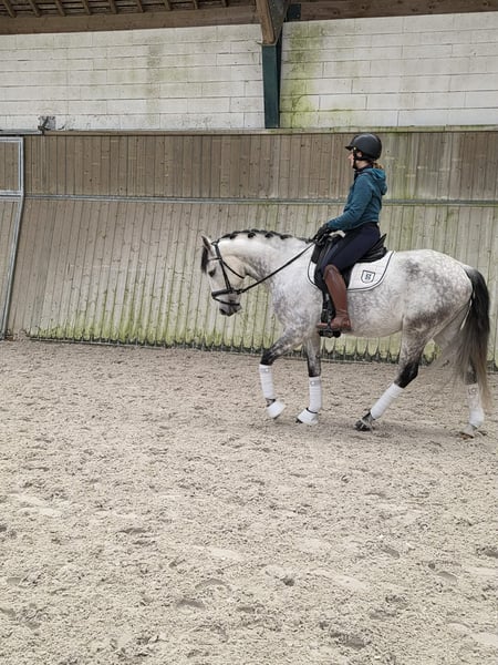 Nous vous présentons Olindo des Bruns, élégant hongre Lusitanien gris, de 8 ans et toisant 1m59. Un cheval harmonieux, compact et bien construit, avec une vraie présence sous la selle et une grande qualité de connexion avec son cavalier. Son modèle typique ibérique s’associe à trois allures équilibrées, avec notamment un trot expressif et des allongements qui constituent l’un de ses points forts. Olindo n’est pas seulement un cheval attachant : c’est un cheval formé, construit avec cohérence, évoluant aujourd’hui au niveau PSG. Côté travail Olindo évolue actuellement au niveau Petit Saint-Georges, avec : Des changements de pied confirmés (point fort du cheval) Une bonne qualité d’allongement au trot Une sensibilité fine au poids du corps C’est un cheval très réactif aux aides, particulièrement sensible à l’équilibre et à la fixité du cavalier. Cette qualité en fait un partenaire précis et agréable pour un cavalier ayant une assiette stable et structurée. Il possède les bases techniques nécessaires pour continuer à évoluer sur le niveau Amateur 1 / Amateur Élite, avec un projet cohérent. Sous la selle Olindo se distingue par : Trois allures équilibrées Une bonne énergie naturelle Une grande générosité dans le travail Une vraie finesse dans les sensations Cheval très gentil au quotidien, il conserve une excellente disponibilité mentale. Tempérament & comportement Très bon comportement général Voyage très bien, monte facilement en petit camion Vit et voyage seul sans difficulté À pied comme monté, Olindo est respectueux et agréable à manipuler. Pour quel cavalier ? Olindo conviendra parfaitement : À un amateur ambitieux souhaitant évoluer sur le niveau PSG À un cavalier fin et stable dans son équilibre À un professionnel recherchant un cheval sensible, réactif et formé Il s’agit d’un cheval avec de la qualité, demandant une certaine précision, mais offrant en retour beaucoup de finesse et de plaisir. En résumé Olindo des Bruns est un Lusitanien formé, évoluant au niveau PSG, doté d’une vraie qualité d’allures et d’une grande gentillesse. Un partenaire sérieux et attachant, idéal pour un cavalier souhaitant conjuguer technique, sensibilité et progression sportive.