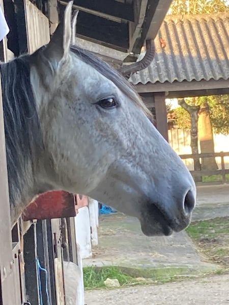Ein 9-Jähriger Lusitano Mix Freizeit Pferd. Ein Pferd mit sehr viel Charakter und intelligenz. Er ist sehr begabt in Dressur. Hat leider den Nerv nicht dazu. Im allgemeinen findet er geritten werden nicht der Highlight. Er will 24/24 und 365 Tagen mit seiner Artgenossen auf der Weide stehen aber er mag es auch wenn er beschäftigt wird was ihm herausfordert. Er braucht viel Abwechslung. Ausreiten ins Gelände findet er auch toll. Es ist absolut kein Anfänger Pferd und ein Pferd das gefühlvolle Reiterhände braucht und guten Umgang mit Pferde kennt. Weil eine sehr deutliche Linie schwarz/ weiß ist Notwendig bei ihm. Seine Trickkiste ist unendlich. Aber wenn man ihm deutlich wissen lässt wo die Grenze sind und seine Dosis Bewegung und Aufmerksamkeit gibt, ist er wie ein Hund. Er hört auf seinen Namen, weiß ganz genau was er darf, nimmt Kommandos an und versucht auf seiner Art mit dir zu kommunizieren. Ich habe die Hoffnung dass er vielleicht in bessere Hände kommt wie bei mir. Ich habe wenig Gefühl für Bodem Arbeit und Tricks beibringen bin ich auch nicht der Held. Wenn er kein Platz findet in andere Hände bleibt er bei mir, ich kenne ihm jetzt durch und durch. Und er lebt in einem 5-Sterne Haus. Er ist nie krank gewesen, nie gelahmt außer warm und viele Fliegen, das macht ihm wahnsinnig. Jährlich war er beim Zahnarzt, osteopaat, Impfungen, Wurmkur,… Er ist sehr gut gebaut. Steht fast auf den 4 Hufe perfekt, hat nie Eisen gehabt, braucht er auch nicht weil er so schön auf den Hufen steht. Vielleicht ist da jemanden wo er vielleicht besser aufgehoben ist als bei mir. Seinen Sattel (ist im Preis drin) würde ich auch mitgeben, er hat einen sehr breiten Widerrist. Er steht jetzt in Portugal. Ich habe im in de Nierlanden gekauft und hat in Belgien und den Niederlanden gestanden, seit 2 Jahre steht er jetzt in Portugal.