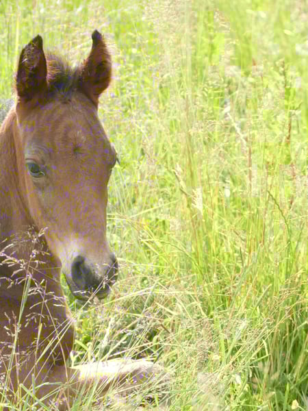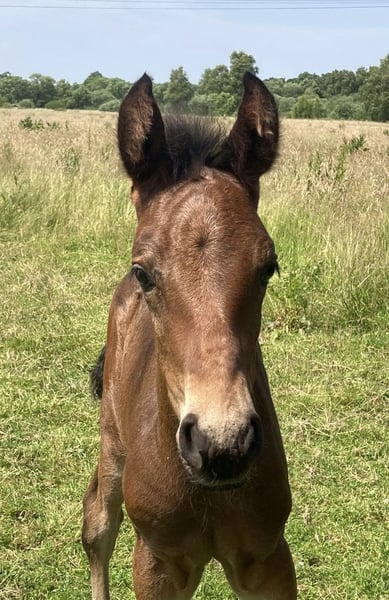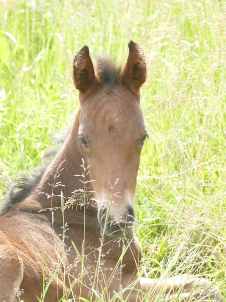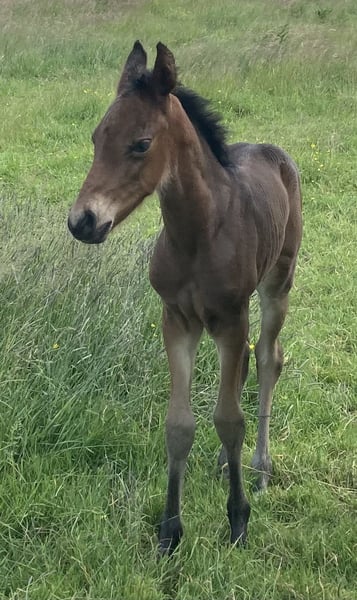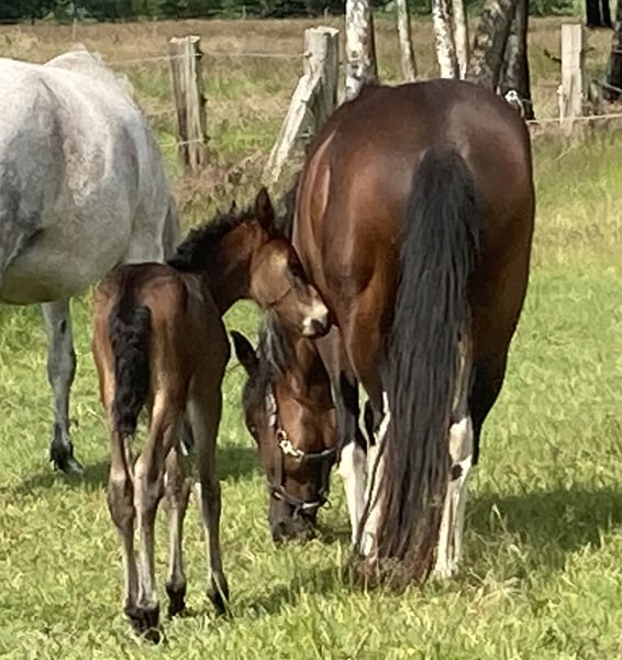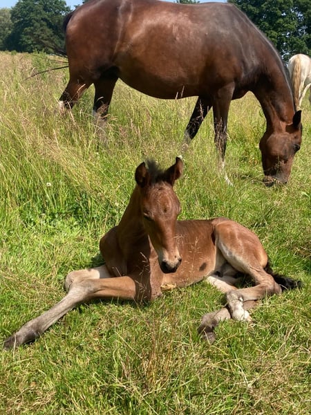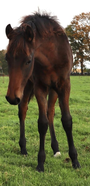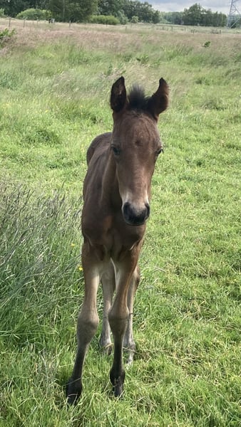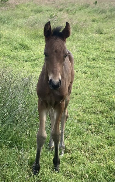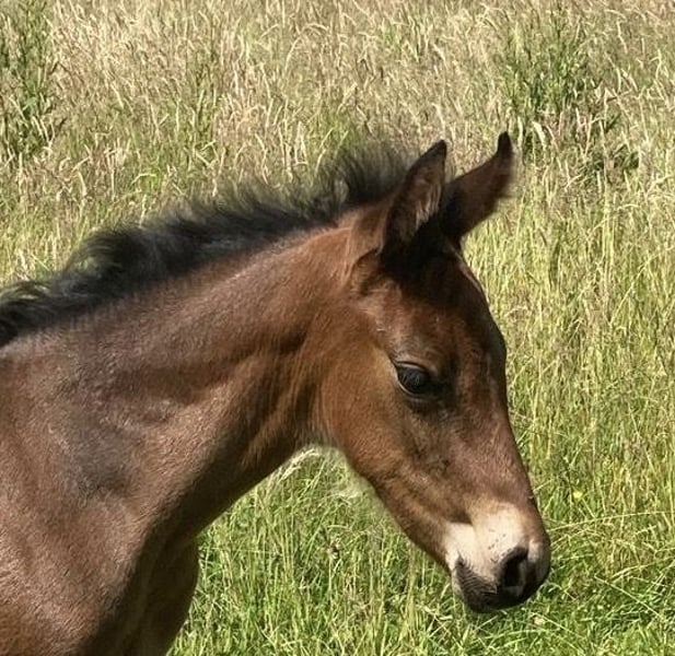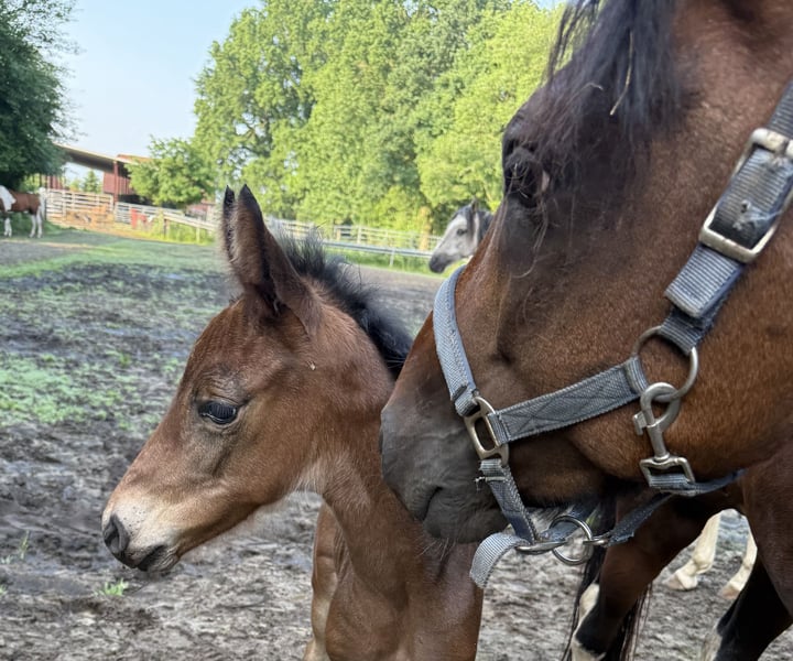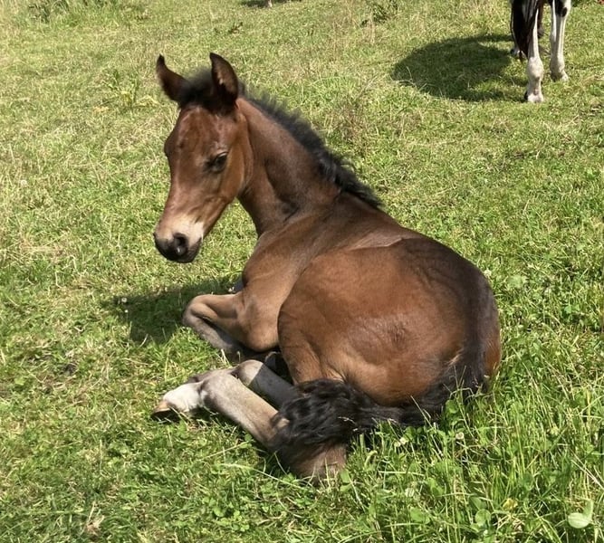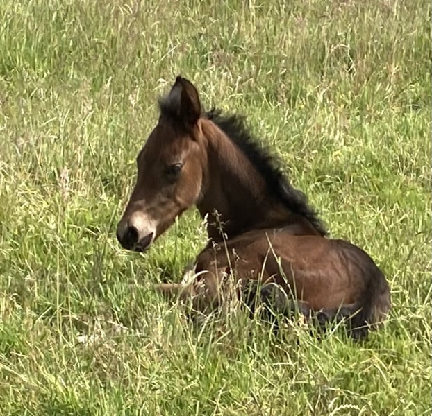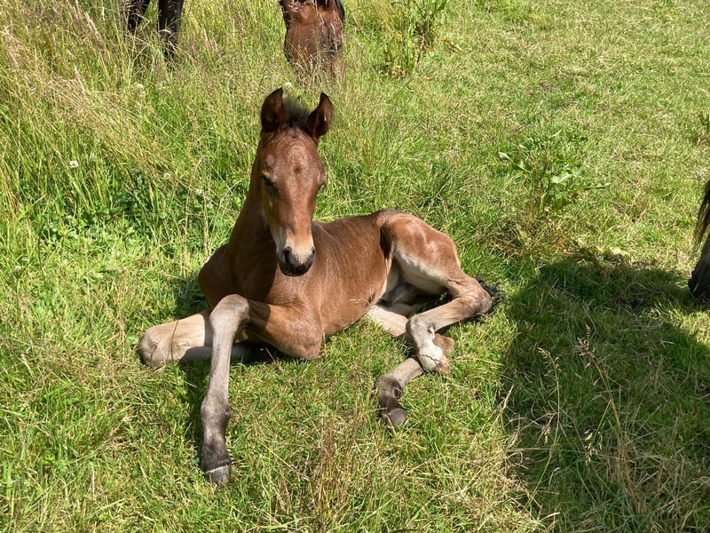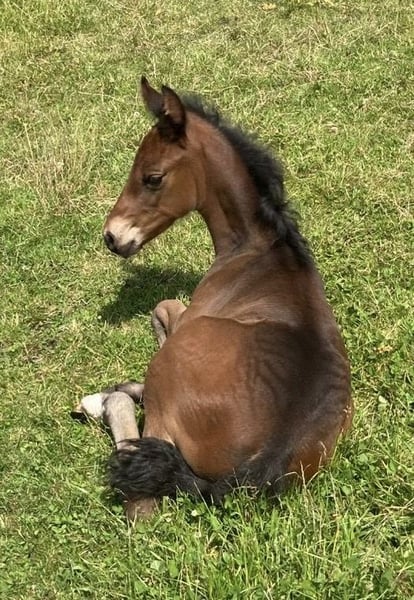 Esco vom Hartungshof geb.am: 31,05.2025 mittel- bis dunkelbraun mit nur ein paar weißen Stirnhaaren und einmal weiß gefesselt. Er ist charmant, neugierig und ein echter Bewegungskünstler mit großartiger natürlicher Aufrichtung, der aber durchaus real auch einen guten "Grundschulabschluss" hingelegt hat , sprich er beherrscht das Fohlen- ABC (Halftern, Füße geben und sich um Mama rundum führen lassen). Seine Gangveranlagung sind sowohl die Marcha Batida wie auch die Marcha Picada. Esco wurde regelmäßig entwurmt und erhielt bereits seine ersten Impfungen gegen Tetanus / Influenza und Herpes. Auch eine Hufkorrektur findet regelmäßig statt. Ich kann leider nicht so sehr viele Bilder ab Juli 25 einstellen, da ich selbst dazu seit Juli aus gesundheitlichen Gründen kaum mehr in der Lage bin zu fotografieren. Esco lebt jetzt in einer Gruppe von fast 20 Pferden von 6 Monate bis 29 Jahre alt - die jungen spielen mit einander, die alten leisten wertvolle Erziehungsarbeit.