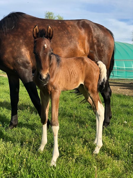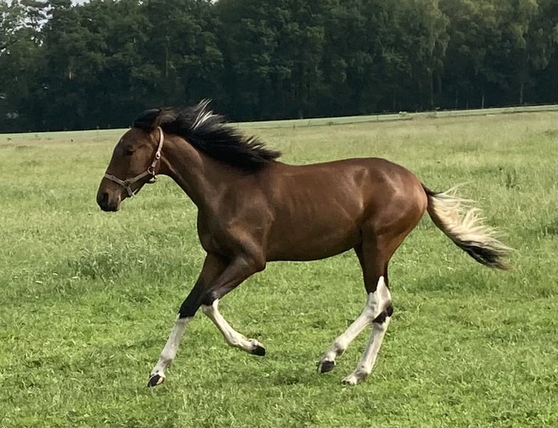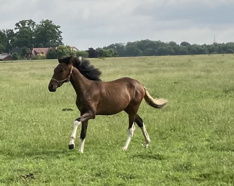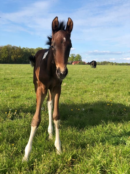 Espresso vom Hartungshof, born on April 20, 2025, is a stunning dark bay gelding with minimal white markings. He is very affectionate and curious, and has already learned the basics of handling young horses (halter training, leading, being tied up – currently only for short periods). He is familiar with hoof handling and trimming. He possesses excellent basic gaits, a very correct conformation, and his natural gait tendencies include Marcha Batida and Marcha Picada. Additionally, he has a well-sprung gallop for a gaited horse. Espresso lives in a herd of 20 horses ranging from 6 months to 29 years old. The older horses contribute valuable educational work, while the younger ones enjoy their leisure time. His final height is expected to be between 150 and 155 cm at the withers.