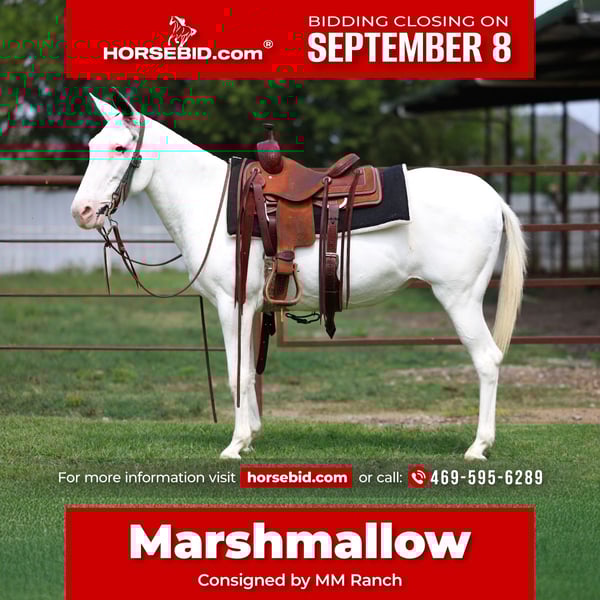 ♦️ 𝐭𝐡𝐞 𝐒𝐞𝐩𝐭𝐞𝐦𝐛𝐞𝐫 𝑺𝒆𝒍𝒆𝒄𝒕 ♦️ Happening now thru MONDAY | SEPTEMBER 8th - Available EXCLUSIVELY on HorseBid's website! For more details and to register visit: www.Horsebid.com CONSIGNOR CONTACT: MM Ranch 469-595-6289 LOCATION: Forney, TX BREED: Mule REGISTERED: No REGISTERED NAME: Marsha COLOR: Paint HEIGHT: 13.2 AGE: 15 GENDER: Molly Mule ✨💖✨Marshmallow aka Marsha✨💖✨ ✨The Ultimate Ranching All Around Family/Kid Molly Mule✨ 🧁🧁15 yo - standing at the perfect fun size of 13.2 hands tall - adorable paint mule🧁🧁 🏆🏆Marsha is the ultimate BOMBPROOF mule. SHE IS SAFE, SOUND, and BROKE. There is nothing you can not do on this mule. She acts like a horse, she is not your typical mule. Even if you are not a mule person you will love this mule. She rides the very best, works to a wagon both single and double, has pulled at plow in the garden, has been roped off of and used to work cattle, has carried a flag in parades and grand entries at rodeos, and is a pro pack mule. She has been on thousands of hunting trips. She has had a gun shot off her both on and around her on hunting trips. She has packed deer and elk out of the mountains. She will cross water, cross bridges, has been rode in every kind of terrain, she is sure footed, not at all tender footed, you can pop a bull whip standing up on her, can slide off behind her, crawl in under her, can open and close gates on her. She is a very pretty traveling mule, has a lovely gait and way of traveling, YOU DO NOT HAVE TO PLOW REIN HER, you can ride and turn her around with just a string around her neck, backs up great, has a great stop, light in the mouth, great short lope, you don’t have to wear spurs to get her to go, she can be rode bareback with just a halter, can catch her anywhere. She will meet you at the gate. Loves attention. Been used on thousands of trail rides and hunting trips all over the US. If you can sit on her you can ride her no matter your riding level or age. I MEAN ANYONE CAN RIDE HER and ABSOLUTELY DO ANYTHING THEY WANT ON HER. She would be perfect for beginners or kids. You can ride her once a month a once a year and she is the same. She does not need a tune up or need to be warmed up. You can just get on her and go. Stands perfect to be saddled and mounted. She will let you use a mounting block, fence, or bucket to get on and off. She will stand perfectly still and let you clip her ears and bridle path. She is not ear shy or head shy. She will let you pick up all her feet, will stand tied still all day long without pawing or moving around, she will stand ground tied when out hunting, she stakes out great hobbled or on a line when over night camping, loads and hauls great. SHE DOES NOT HAVE ANY BAD HABITS OR QUIRKS. Does not buck, will not run off, will not kick, not buddy sour or barn sour, she will ride alone or in a group, loads and hauls great. She is not scarred of anything, will not spook at on the trail, she is use to hunting dogs making lots of noise and running up behind her. SHE IS A BEEN THERE DONE THAT ALL AROUND EXCELLENT MULE. She has a sweet willing to please personality and will do whatever is ask of her. You can look a long time and will not come close to finding another one like her.🏆🏆 🌎 Shipping available anywhere.