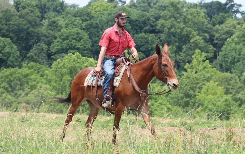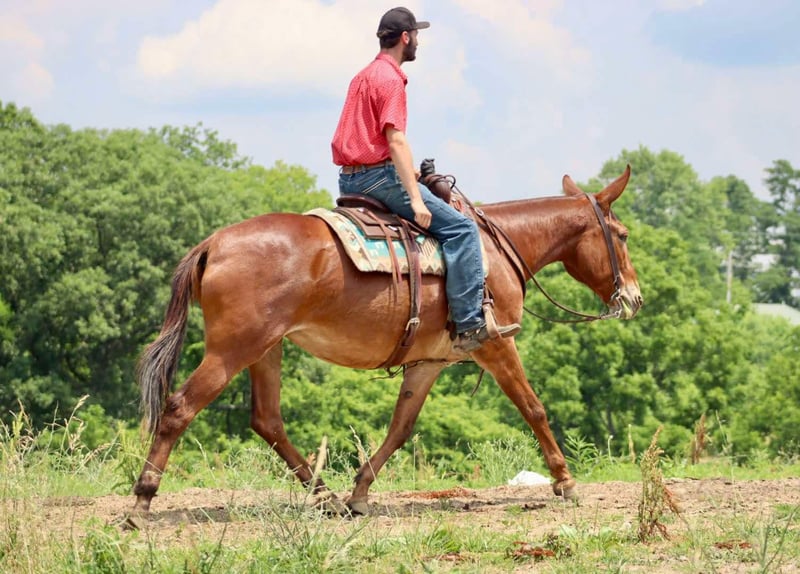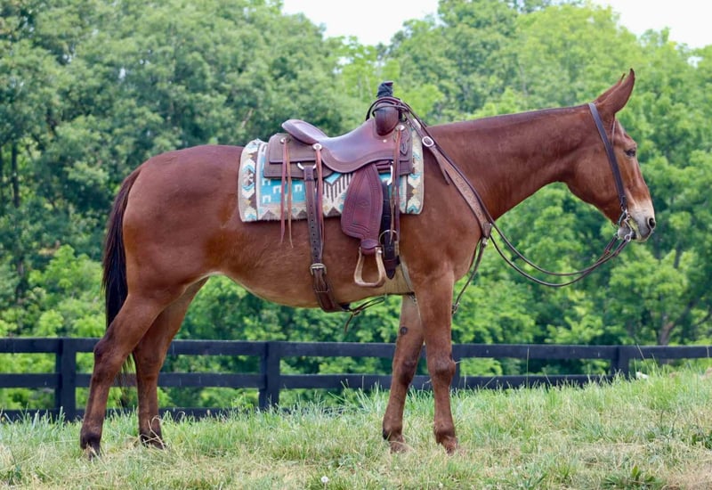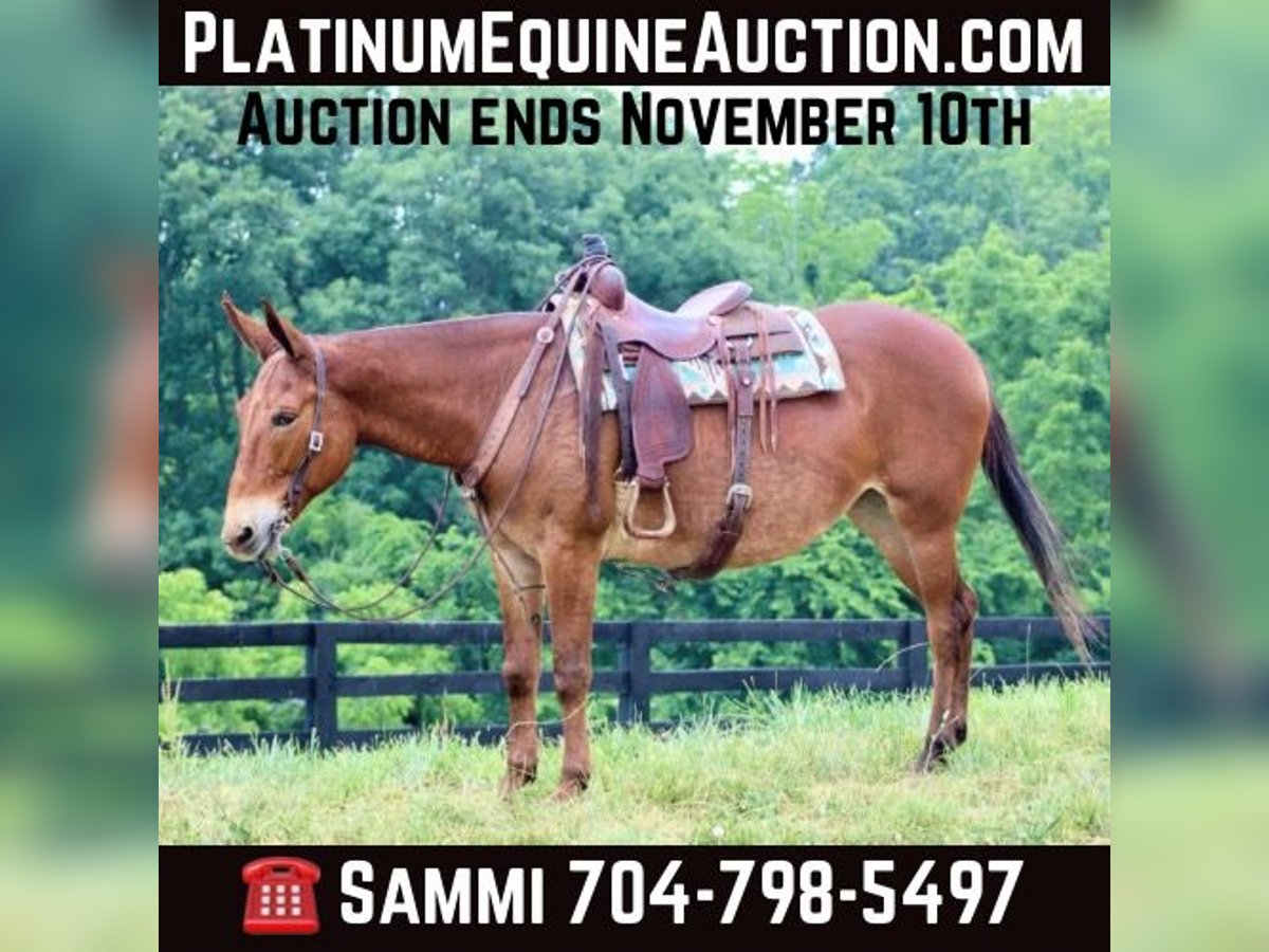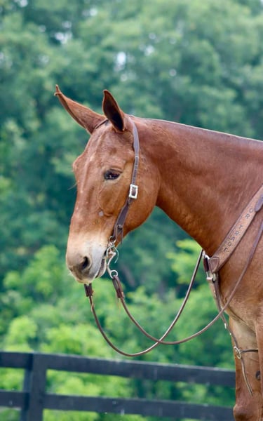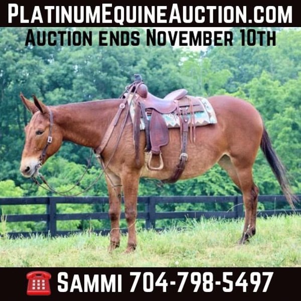 ONLINE AUCTION Place your bids at www.PlatinumEquineAuction.com Starting Bid $3500 Auction ends November 10th, 2024 Need a new saddle? Check out White Rock Saddles on our website or Facebook! Hope is an 8 year old, 16 hand Molly mule. She is a big, eye catching Molly that is sweet and gentle. She is well broke to ride with a nice walk, jog, and lope. She will ride one handed and has a nice little turn around. Hope does excellent on trails either out with a group or alone. She crosses water, steps over logs, and crosses bridges. Her friendly and quiet personality is great for all levels of riders. She is one we choose for guests to ride when they need a dependable mount. Hope travels well. She has been on countless camping trips. She ties out on high line well. Hope is easy to catch, stands tied nicely, and hauls well in the trailer. She does well turned out in a mixed herd. Hope does have an old injury on her right knee that left a bump. With average riding whether on the trails or arena, she has always been sound with us and doesn’t require maintenance. She was recently examined by a vet on Oct 23rd and we have radiographs on file for anyone interested in seeing them. For someone looking for a nicely trained mule that is safe and enjoyable for the whole family that isn’t looking to do extreme mountain riding on a regular basis, Hope will be a great match! For more information, please call or text Sammi Waugh 704-798-5497 Located in Brooksville, KY. ONLINE AUCTION Place your bids at www.PlatinumEquineAuction.com Starting Bid $3500 Auction ends November 10th, 2024 Need a new saddle? Check out White Rock Saddles on our website or Facebook!