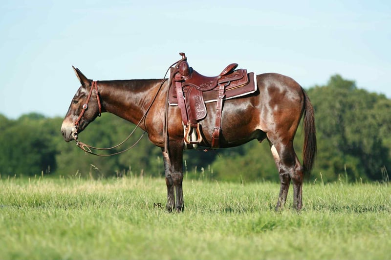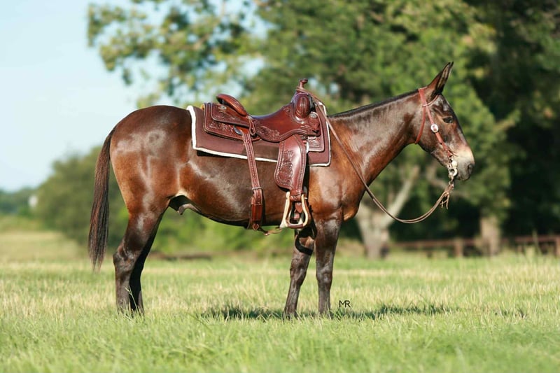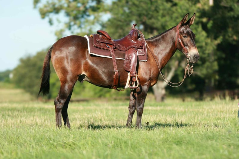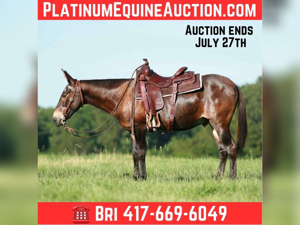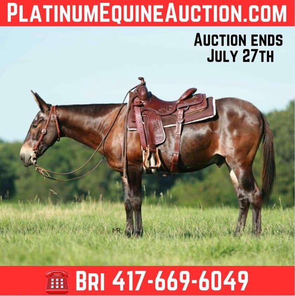 ONLINE AUCTION Place your bids at www.PlatinumEquineAuction.com Starting Bid $3500 Auction ends July 27th 2025 Need a new saddle? Check out White Rock Saddles on our website or Facebook Yonder is a 18yr old John mule that stands 14.1h tall. He has a great personality and always wants to be included in everything you do. He has most recently been used on trail rides, hog hunts and to doctor some here and there. He is finished on the head and heel side but has mostly been roped on out in the pasture. Yonder has been to the chuckwagon races, group trail rides, overnight hunts/camping trips, clinics, rodeos, etc. He will pack beginner ropers around and he does not get offended by their lack of coordination while “learning the ropes”. Yonder has a very big personality and loves to get all the attention. He enjoys being with his people. If you want one that will greet you when you go to the barn, he will be there waiting for you and braying every time! He is easy to catch, ties great and easy to load/unload. He’s easy with his ears and stands like one should for the farrier. Great to tack up and bathe. He does stand at a mounting block or you can easily mount from the ground. Yonder is a very social guy and enjoys being turned out with a mixed group. He is safe with dogs and cattle. Yonder has packed beginners to advanced riders but prefers a confident rider over all. If you are a confident rider that can steer and use your legs, in a kind manner, he would go to the ends of the Earth for you. Yonder is up to date on all vaccines, coggins, dental, and farrier work. PPEs welcome at buyers expense to any local vet of your choosing. Please reach out for more information or if you’d like to set up a time to come try him before the sale ends. For more info contact Bri Mercer 417-669-6049 Located in Everton, MO. ONLINE AUCTION Place your bids at www.PlatinumEquineAuction.com Starting Bid $3500 Auction ends July 27th 2025 Need a new saddle? Check out White Rock Saddles on our website or Facebook
