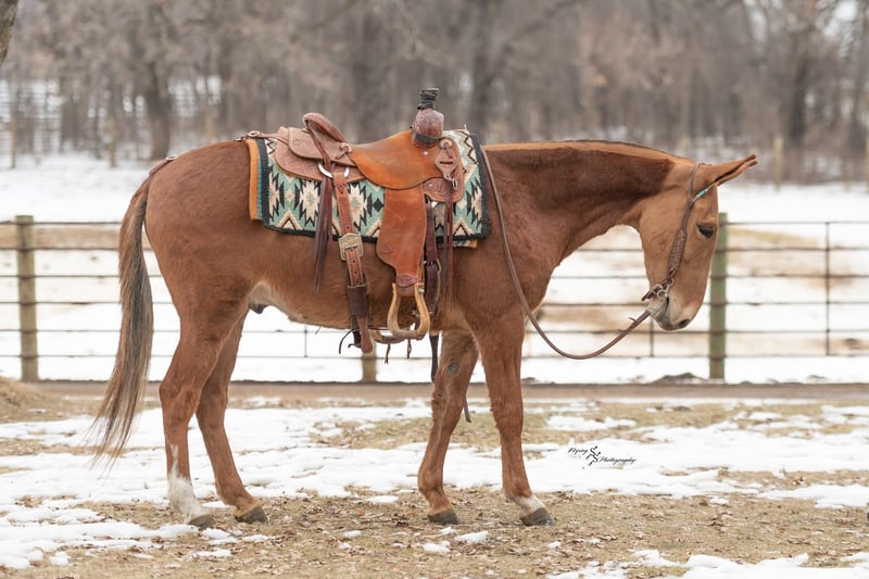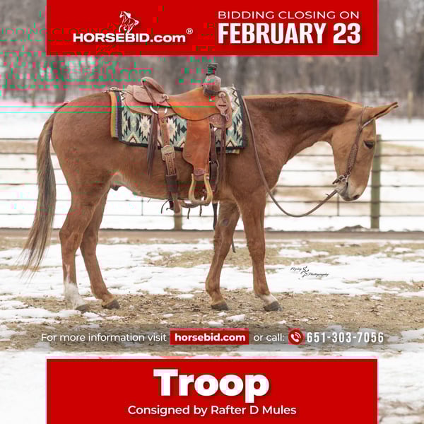 💎 𝐓𝐇𝐄 𝓓𝓲𝓪𝓶𝓸𝓷𝓭 𝐒𝐇𝐎𝐖𝐂𝐀𝐒𝐄 💎 Happening now thru MONDAY | FEBRUARY 23rd - Available EXCLUSIVELY on HorseBid's website! For more details and to register visit: www.Horsebid.com CONSIGNOR CONTACT: Rafter D Mules 651-303-7056 LOCATION: Hastings, MN BREED: Gaited Mule REGISTERED: No REGISTERED NAME: Troop COLOR: Sorrel HEIGHT: 14 AGE: 5 GENDER: John Mule Troop is a sweetheart of a mule who is very personable. He would make an excellent field trial or endurance mule and is already a wonderful trail mule. He has smooth gaits and covers ground. Troop crosses logs without hesitation, downed timber, or anything you might find out on the trails. He is very traffic safe, walks across ditches quietly, and crosses water. Troop stands at the mounted block to be mounted. He clips well, catches easily, picks up his feet, and stands quietly to be tacked up. Troop also lopes both directions, correctly picking up his leads. He will cross over the bridge and entertain many of the trail obstacles. Troop has a great foundation and is ready to be someone's favorite mount! He tolerates all of the commotion you can possibly throw at him. He is used to being pastured with other livestock and gets along well with everyone. He is also used to being around small pets. If you would like to meet Troop prior to the auction ending, or have any questions about him, please contact Dillon at 651-303-7056.