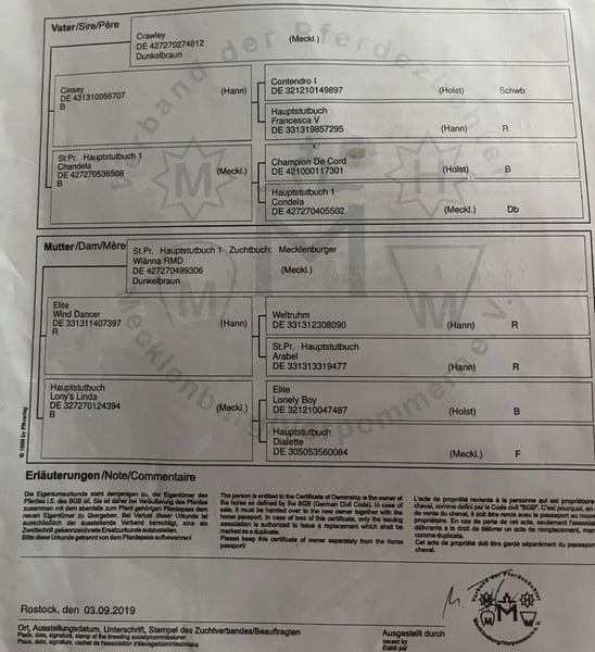 For Sale – Mecklenburg Mare "Caya RMD" I am offering my beautiful Mecklenburg black mare, "Caya RMD," born on April 30, 2019, with an approximate height of 1.65 meters. Training & Characteristics: • Lunged and saddle-broken (familiar with saddle, bridle, and rider’s weight) • Under saddle in walk, trot, and canter • Has already jumped small fences under saddle • Knows and demonstrates free jumping with talent • Confident in the terrain – both ridden and as a lead horse • Kid-friendly and well-behaved • Resiliently kept in a mixed herd • Loading and farrier-friendly • Vaccinated Thanks to her quality and pedigree, she is also very interesting for breeding. Pedigree: Sire: Crawley (Mecklenburg) • by Contendro I (Holstein) • out of Chandela (Mecklenburg) by Champion De Cord Dam: Wianna RMD (Mecklenburg) • by Wind Dancer (Hannover) • out of Lonny’s Linda by Lonely Boy Caya impresses with her balanced temperament, rideability, and jumping ability. She is a wonderful partner for ambitious leisure riders, young horses in show jumping, or for breeding purposes. Only available to good and suitable hands. 📍 Location: Gribow 📞 01627373048