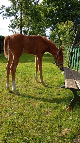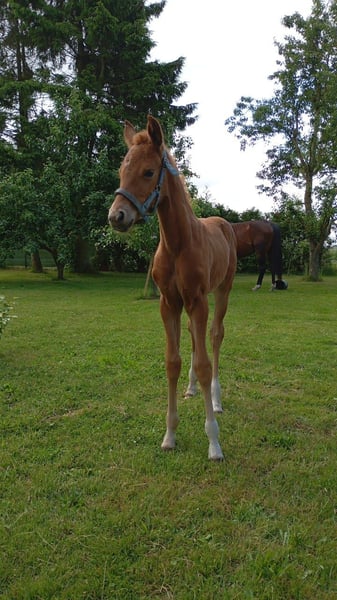 Hübsches Stutfohlen von Pjethro (Kjento -Desperado) Sie ist in Juni geboren hat 3 tolle Grundgangarten. Ihre Mutter ist eine Staatsprämienstute von Sandro Hit/Lanthan,sie brachte schon sehr gute Fohlen sie wurden zu Blue Horse sowie an Schokemöhle verkauft . Eine Tochter von Joviam würde hochpreisig in die USA verkauft Mit ihren Charakter weiß sie zu gefallen immer anhänglich. Sie kennt das Fohlen Abc , regelmäßig entwurmt . Auf der Fohlenschau erhielt sie die Eliteprämie . Später ein tolles Pferd für den Dressursport Kann zur Aufzucht auch noch stehen bleiben