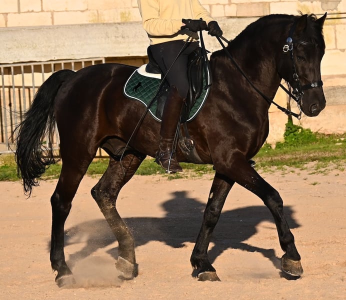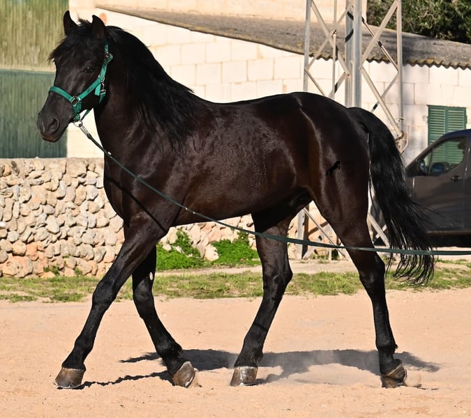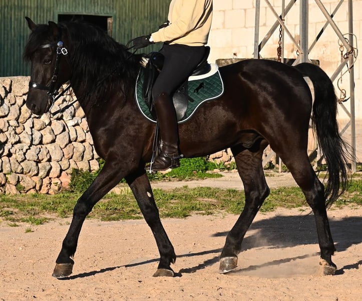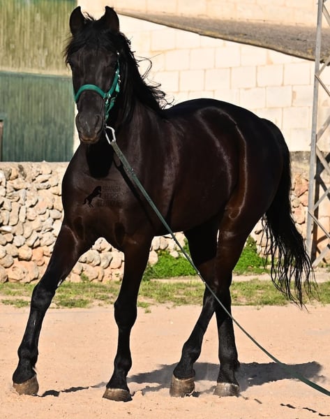 Dieser 2014 geborene, reinrassige Menorquinhengst, hat so einiges zu bieten! Er ist in jeder Situation absolut sicher und im Gelände klettert er über felsige Abschnitte, in stoischer Ruhe. An der Hand ist er sehr brav und immer aufmerksam bei seinem Menschen. Geritten ist er in der örtlichen typischen Doma Menorquina (Einhändig), sowie klassisch englisch. Ihn bringt wirklich nichts aus der Ruhe, denn er hat sowohl Showerfahrung, wo er mehrfach in einer Hengstquadrille aufgetreten ist und mehrfache Fiestaerfahrung. Kurzum, ein bombensicheres Pferd! Unterm Sattel beherrscht er laterale Lektionen, den spanischen Schritt und den typischen BOT der Menorquin (Laufen auf der Hinterhand)- doch keine Sorge, wer das nicht mag, er macht es nur auf Abruf und nicht als "Überraschung". Sein Charakter ist sehr ruhig und das merkt man auch beim Reiten. Jede Woche geht es mindestens einmal ins Gelände, alleine oder mit Anhängerfahrt zu einem stundenlangen Gruppenausritt! Er ist also verladefromm und geländesicher auf allen Untergründen, alleine sowie in der Gruppe. Seine schöne, barocke Halsung und die natürliche Welle in der Mähne, stechen sofort ins Auge. Seine Schönheit hat er schon mehrfach unter Beweis stellen dürfen, denn auch modeln für internationale Fotografen, gehört zu seinem Repertoire. Auch da ist er an der Hand über Felsen geklettert, um an gute Spots zu kommen, ist stoisch gestanden ohne Gezappel und eines der Bilder von ihm hat sogar einen internationalen Fotowettbewerb gewonnen. In einem Menorquinkalender 2026 ist er auch vertreten (Bestellung vom Kalender über mich möglich!). Abstammen tut er ganz alter Urlinien des Menorquin und diese Pferde zeichnen sich durch ihre Ausdauer, ihren Mut und ihre Treue aus- alles Punkte die er auf jeden Fall erfüllt. Er ist 166cm, gekört und hat keine weißen Abzeichen, wie es das Zuchtziel wünscht. Die Abendsonne lässt ihn etwas heller erscheinen, aber er ist definitiv ein Rappe, wie es ein Menorquin sein soll. Wer keinen Hengst halten kann/möchte, für den besteht selbstverständlich die Option der Kastration vor Ort. Es wurden 01/2026 Röntgen von ihm gemacht, die gerne zur Verfügung gestellt werden. Ein wahres Juwel an Pferd mit gutem Charakter und auch Showpotenzial. Preis der Qualität entsprechend! Sein Standort ist Menorca. Videos und Abstammung gerne auf Anfrage. Gerne organisiere ich vor Ort eine AKU, Beritt, Kastration, Transport oder auch ihre Reise, sollten Sie persönlich zum Anschauen kommen. Details dazu gerne auf meiner Seite oder im Gespräch. Saludos aus Spanien