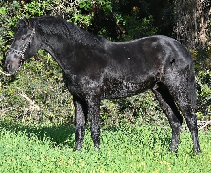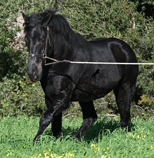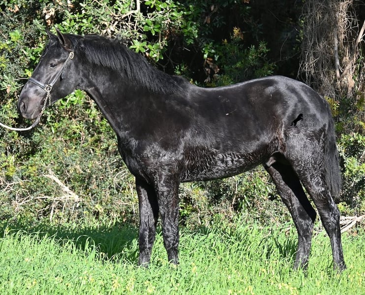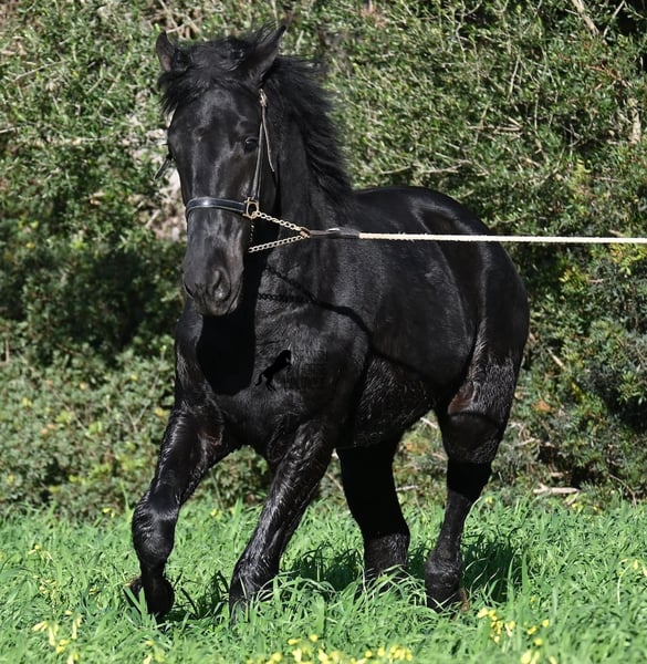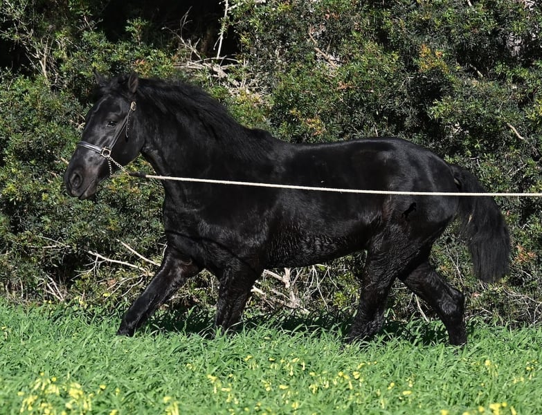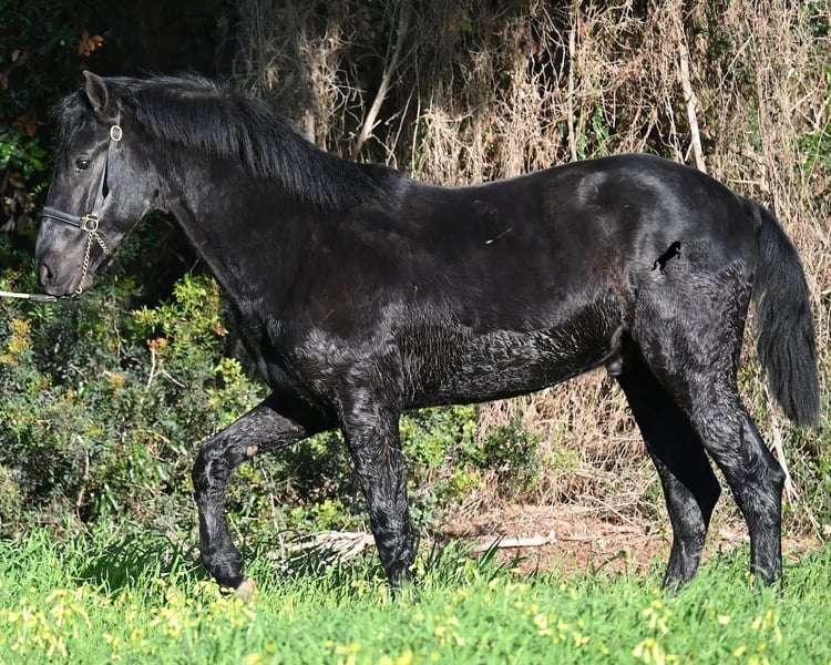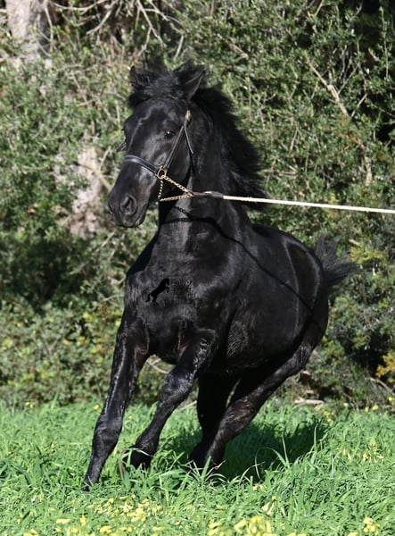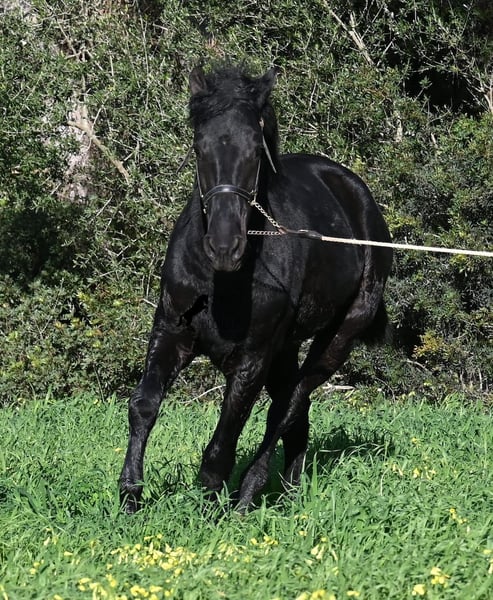 Este semental de Menorquina, nacido a principios de 2024, es un auténtico corazón de caballo. Es increíblemente dócil y tranquilo, un verdadero caballero a pesar de su juventud. En su manejo, no podría ser más obediente, ya sea al limpiar sus cascos, que levanta sin que se le pida, o al pasearlo junto a otros caballos en libertad, caminando tranquilamente a su lado. En el box, permanece muy paciente sin inquietarse y espera tranquilamente a que se le indique qué hacer. En movimiento, muestra sus hermosos aires y su calidad, ya que lleva sangre de campeón, lo cual se nota claramente en él. Tradicionalmente, en Menorca, se le suele rapar la crin en la etapa de potro, pero en su caso, se ha dejado crecer, y se puede ver que cumplirá con la imagen de Black Beauty, ya que tiene una ondulación natural en la crin. Es completamente negro, sin marcas blancas, y vive en un sistema de robusta convivencia 24/7, por lo que está acostumbrado tanto al clima extremo, con temperaturas que alcanzan los 40°C en verano y heladas en invierno, como a pastos abundantes. También conoce y respeta la valla eléctrica. Su tamaño final esperado será alrededor de 1,60 m de altura. En el futuro, será un caballo interesante para muchas disciplinas de doma y también destacará en el tiro, si se le entrena para ello. Para quienes deseen adquirirlo más adelante, existe la opción de reservar un lugar en la finca para su cría. Videos y pedigrí disponibles bajo petición. Su ubicación actual es en Menorca. Con gusto puedo organizar una revisión de potro en la finca, transporte o incluso su viaje si deseas visitarlo en persona. Para más detalles, puedes consultar mi página o contactarme directamente. Saludos desde España