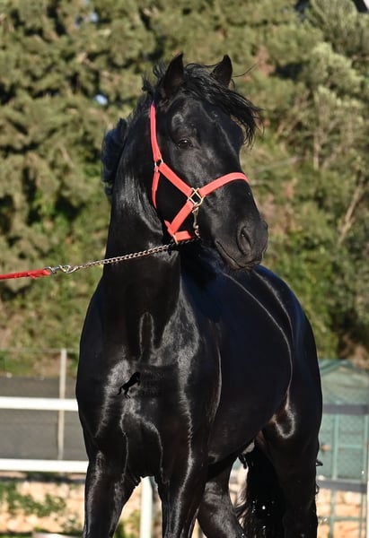 Dieser 2021 geborene, reinrassige Menorquinhengst, ist ohne Zweifel ein bildschöner Vertreter dieser edlen Rasse! Glänzend schwarz mit natürlicher Welle in der Mähne und nicht ein weißes Haar- Eleganz pur! Dazu hat er noch sehr gute Gänge, die ihn für die Dressur interessant machen, sollte man ihn auf englisch trainieren wollen, denn aktuell ist er in der menorquinischen Reitweise ausgebildet, die einhändig geritten wird. Die Umstellung wird ihm aber bestimmt nicht schwer fallen, denn er ist sehr intelligent und da er vor der Kutsche eingespannt wurde, kennt er die Zügelführung. Ein absolut feines Pferd unter dem Reiter, sehr arbeitssam und unglaublich wiff. Da er auch sehr biegsam und leichtfüßig ist, ist er auch in interessanter Kandidat für die Working Equitation. Seine Grundausbildung ist sehr solide mit lateralen Arbeiten und spanischen Schritt beherrscht er auch. Sowie den typischen Bot, das Steigen, wobei er es nur auf Abruf macht, weil er ganz klar die Kommandos respektiert. Er hat schon stattliche 169cm und wird noch an barockem Exterieur etwas zulegen, da die Menorquin Spätentwickler sind und noch nicht voll entwickelt bis 8 Jahre. Seine hervorragende Abstammung von einem sehr guten Vater klassischer Linien und einer prämierten Mutter mit Eliteblut, hat er schon weitergegeben und ein schönes Hengstfohlen hervorgebracht. An der Hand ist er erzogen aber etwas verspielt, denn er wird aktuell nicht so viel gearbeitet, aus Zeitmangel der Besitzer, was auch der Verkaufsgrund ist. Sobald er sich 5 Minuten die Beine vertreten hat, ist er tiefenentspannt und bleibt sogar frei am Reitplatz neben einem minutenlang stehen, wenn man sich unterhält. In fördernden Händen, hat dieses Pferd richtig viel Potenzial und auch für den Freizeitbereich ist er ein richtiger Schatz, wenn er etwas mehr Auslastung (oder Offenstall/Paddock) bekommt. Ausreiten geht er auch, meistens zu zweit oder in der Gruppe. Wenn Stuten dabei sind, tänzelt er kurz um zu zeigen, wie schön er wirklich ist, merkt aber gleich dass es verlorene Liebesmüh ist und geht in die Entspannung. Wer ihn als Hengst nicht halten kann, für den besteht selbstverständlich die Möglichkeit der Kastration vor Ort. Sein Standort ist Mallorca. Videos und Abstammung gerne auf Anfrage. Gerne organisiere ich vor Ort eine AKU, Beritt, Kastration, Transport oder auch ihre Reise, sollten Sie persönlich zum Anschauen kommen. Details dazu gerne auf meiner Seite oder im Gespräch. Saludos aus Spanien