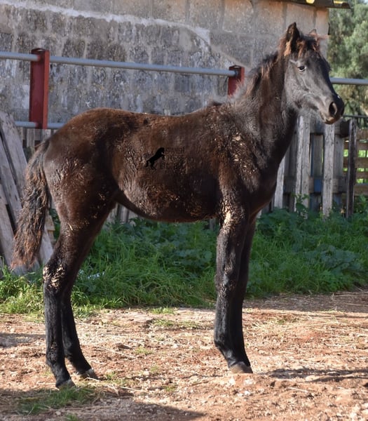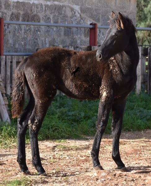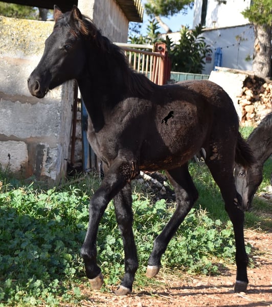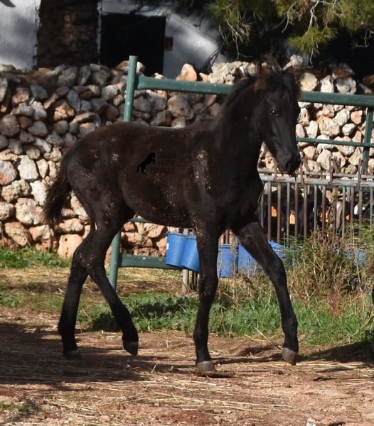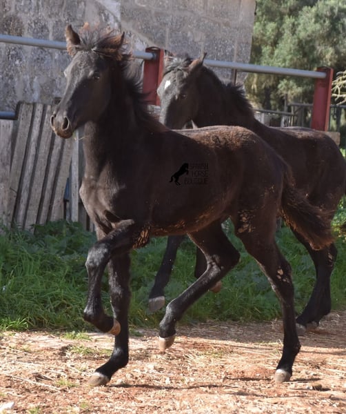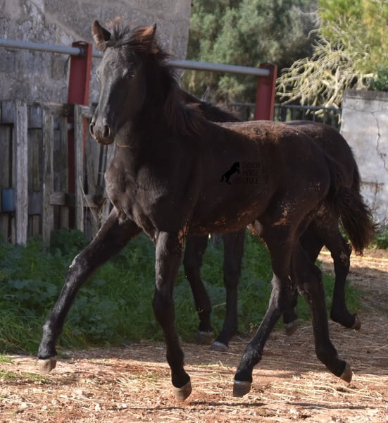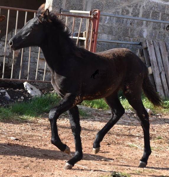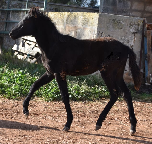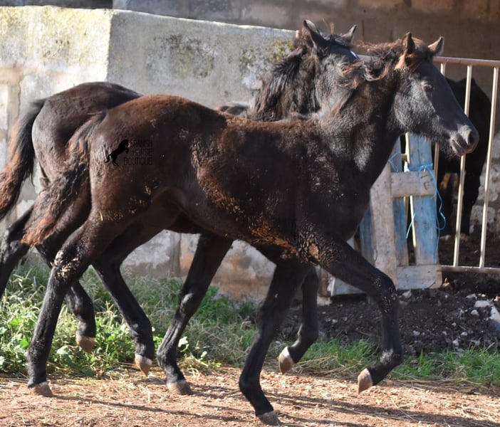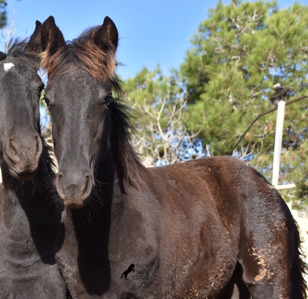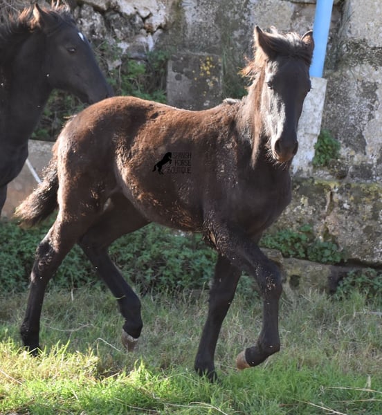 Born in the summer of 2024, this purebred Menorquin mare with full paper is a very cute young lady. She is completely black with no white markings and her dad is a multiple award winner for his awards in the local Doma Menorquina. Her paternal grandfather is one of the 3 elite stallions of the breed, with a lot of knee action, which has also come through in her. She is very compact and her expected final height is around 157cm. She is weaned together with her foal friend and is familiar with both the robust stall and the box. She is halter-trained and as her passport has already been issued, she is ready to move to her forever home. For today's steadily increasing price range of the Menorquin, she is also very affordable ;) If you want to get her later, a breeding place can be organized for her. Videos and pedigree on request. Her location is Menorca. I would be happy to organize a foal AKU on site, transport or even your trip, should you come to see her in person. Details can be found on my website or in conversation. Saludos from Spain