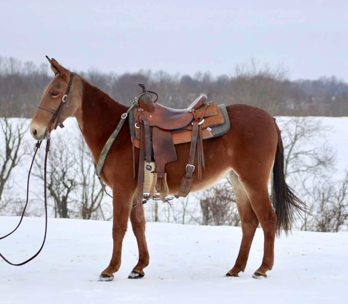ONLINE AUCTION Place your bids at www.PlatinumEquineAuction.com Starting Bid $3500 Auction ends February 9th, 2025 Need a new saddle? Check out White Rock Saddles on our website or Facebook! Rose is an 8 year old, 14 hand gaited Molly mule. Rose has a very nice ground covering, ear flopping walk when she gets in gear and headed down the road or trail. Rose is experienced on the trails. She crosses natural obstacles with ease. Goes through and across water crossings without worry. She is sure footed on narrow and technical trails. She steps over logs and goes through ditches. Rose rides out alone or with a group. She can keep up with other gaited animals or ride slower with quarter type. She is a mountain goat type, if you point her nose, you better be ready to go! She is a forward mule with a lot of heart to ride all day. Rose stands nicely to saddle. She ties and clips. Has nice stall manners. Loads and unloads easily. Rose rides off nicely if she has had time off, but like anyone excels when ridden in a regular riding program. She has been on quite a few big, organized rides. We have ridden her through our herd of cows and checking fences with no issues. Rose is the type of mule that you need to earn her trust and respect. It’s easy to get, but experienced mule owners understand her type. She will do best in a home with 1 or 2 riders, not so much for a guest or “dude” type of mule. With that being said, she will give her person 110% every ride and only gets better the more she knows and understands her person. For more information, please call or text Sammi Waugh 704-798-5497 Located in Brooksville, KY. ONLINE AUCTION Place your bids at www.PlatinumEquineAuction.com Starting Bid $3500 Auction ends February 9th, 2025 Need a new saddle? Check out White Rock Saddles on our website or Facebook!