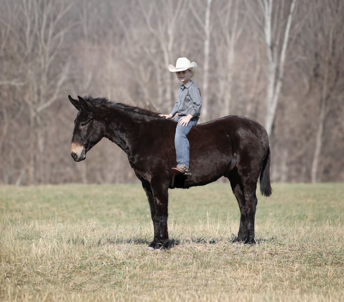 ONLINE AUCTION Place your bids at www.PlatinumEquineAuction.com Starting Bid $3500 Auction ends January 4th, 2025 Need a new saddle? Check out White Rock Saddles on our website or Facebook Jonah is a beautiful black John (gelding), he is a 10 yrs old and he stands a stocky built, 15 hands tall! This is one mule that is 100% no fuss-easy to ride! Whether you ride him every day or leave him off for a couple months, he rides gentle. My 7 year old nephew has ridden him around the farm and though the trails. Jonah is very laid back, rides on a loose rein and is never in a hurry. Jonah is not spooky and has miles and miles of experience from the mountains to the valleys he will cross anything that he is asked to from rivers to creeks, scale steep slopes while being sure footed and picks his path is a tight situation. He can handle the rough rocky trails, steep inclines and deep water… nothing bothers him and he feels right at home on the trails! He has been ridden around cattle. Jonah has been hauled on week long and weekend trail rides. He has been ridden by all members of our family. He loads right up with no issues. Jonah has a smooth lope although his favorite thing to do is walk on a loose rein and enjoy the scenery. He picks up his leads and rides in the arena as well as outside. Dogs do not bother him and is traffic safe! Jonah has no issues with his ears. Call Trevor Patrick 606-516-8069 with any questions. Located in Brodhead, KY. ONLINE AUCTION Place your bids at www.PlatinumEquineAuction.com Starting Bid $3500 Auction ends January 4th, 2025 Need a new saddle? Check out White Rock Saddles on our website or Facebook