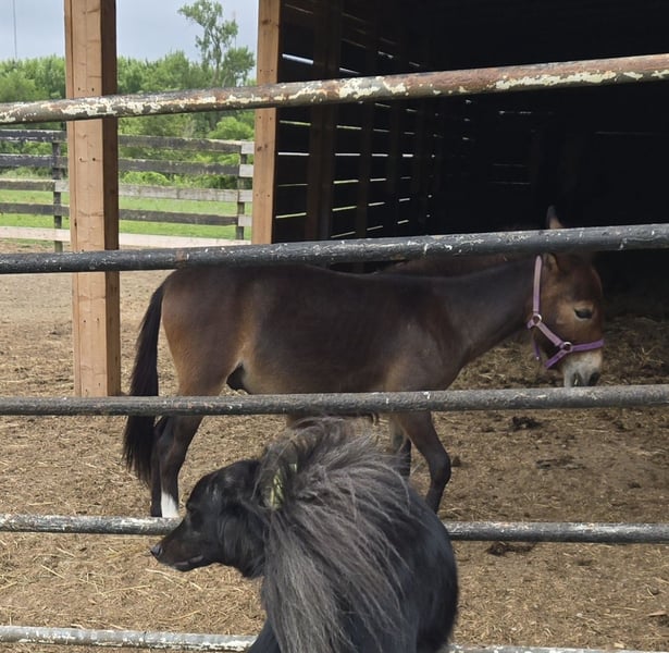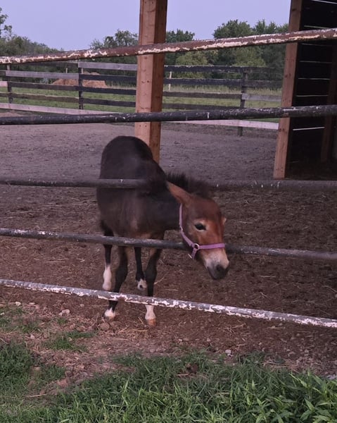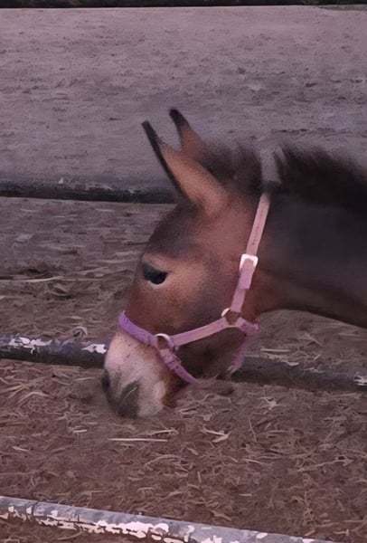 Hennessy is a yearling john mini mule. He has been handled & lead by kids since he was born. He is working on his lunging and driving terms. He was just working at a petting zoo with his donkey dad. He gets along with my healer and the big guardian dogs. Only selling due to financial reasons, otherwise he would be trained as a partner to team with his dad. He has been staying with a horse that is a mare, and gets along with the petting zoo animals as well.