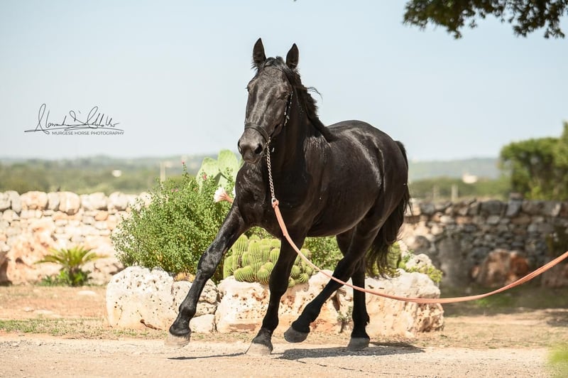 The 2.5-year-old Tristano is still a stallion. He belongs to the baroque Murgese breed and currently has a height of 156 cm, with an expected final height of 164 cm. The costs of castration are already included in the purchase price. Tristano presents himself as friendly and open-minded and has mastered the basics of young horse training. A balanced character and a clear mind make him an ideal partner for leisure, working equitation, or as a future riding or driving horse. The young stallion is still with his breeder in Apulia (Italy) and can be viewed there at any time by appointment. He also comes with X-rays, which can be viewed upon serious interest. We also plan everything else for you – clinical pre-purchase examination, processing of the purchase contract, transport to your home stable, etc. Cavallo Murgese.de – on behalf of and in collaboration with the Italian Murgese Association A.N.A.M.F.