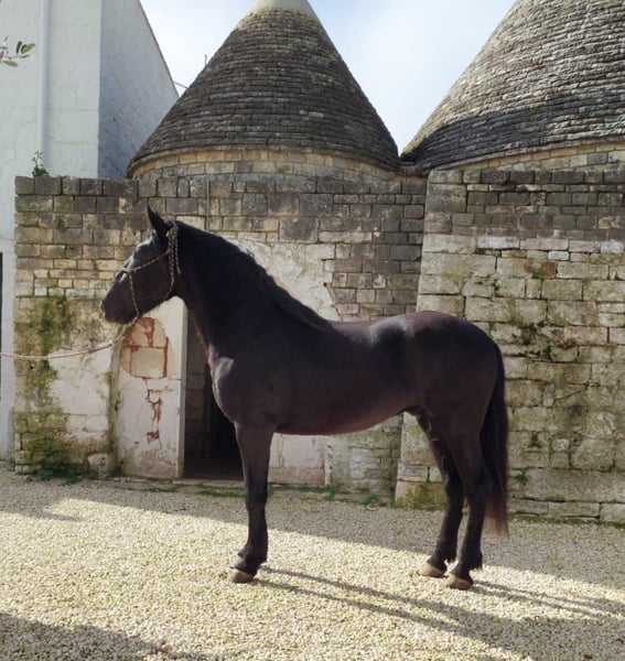 T.F. Proust Tequila An outgoing, very gentle on the hand, and affectionately cheeky – these words best describe Tequila. In the round pen, Tequila pays close attention to his handler and responds to the slightest changes in body language. He is very affectionate towards people, always ready for a little joke ;-). Tequila grew up with some buddies in the herd of the breeder from whom we are now able to offer him. He is familiar with life on a masseria, which means: dogs, guard geese, cows, tractors, and more dogs. He has professionally learned the basics of young horse training and is now looking forward to the next steps in his education with you. Currently, Tequila is not yet castrated but can be done upon request (included in the price) by the breeder. Born in 2023, his estimated final height is around 16.1 hh. If you would like to know more about Tequila – we look forward to your message. X-rays are available and, upon serious interest, can of course be viewed. We will also organize everything else for you – clinical pre-purchase examination, handling of the sales contract, transportation to your home stable, and more. Cavallo Murgese.de – on behalf of and in cooperation with the Italian Murgese Association A.N.A.M.F.